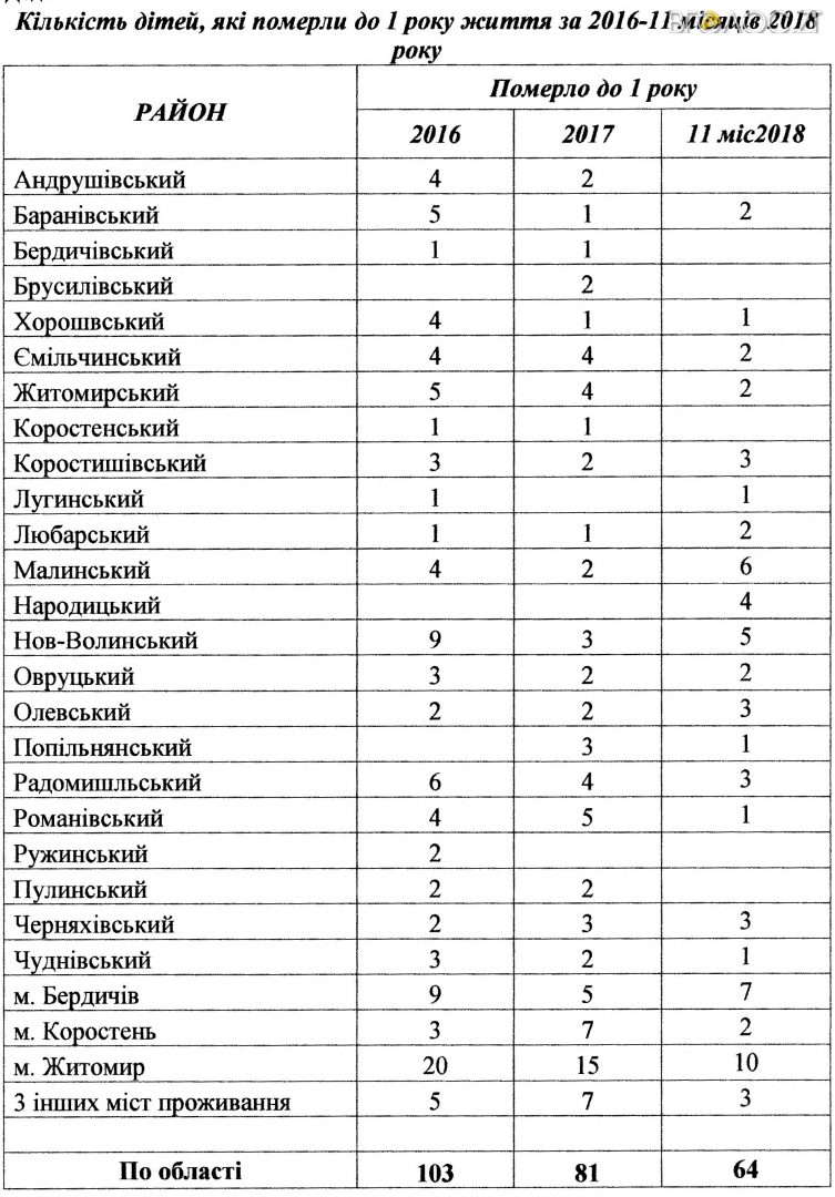 Відповідно до наданої інформації, найбільше смертей зареєстровано у Житомирі та Бердичеві. У порівнянні з 2016 та 2017 спостерігається зниження рівня дитячої смертності.