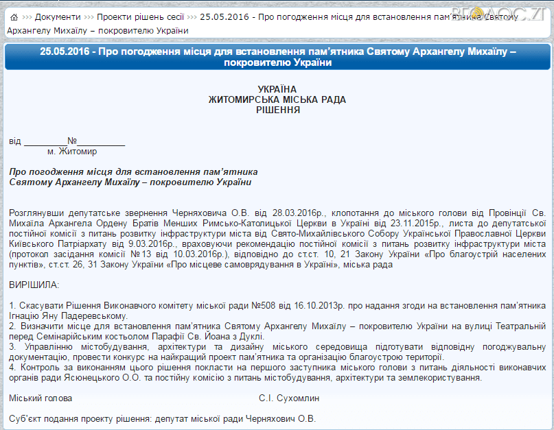 Як уже повідомлялося, 18 березня 2016 року, на сайті міської ради уже був опублікований проект рішення сесії міськради про скасування рішення виконкому від 16 жовтня 2013 року та встановлення замість Падеревського пам’ятника Святому Архангелу Михаїлу. Однак нині цього документа в переліку проектів рішень сесії немає. У новому проекті рішення, оприлюдненому 25 травня 2016 року, також йдеться про скасування Рішення Виконавчого комітету міської ради № 508 від 16.10.2013 р. «Про надання згоди на встановлення пам’ятника Ігнацію Яну Падеревському».