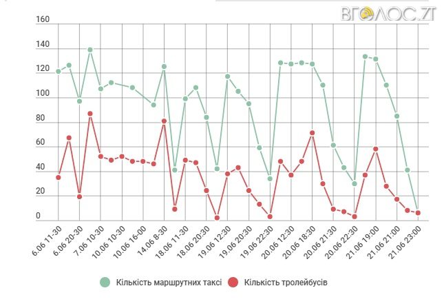 На графіку нижче показано кількість громадського транспорту на маршрутах у різні дні та години. Видно, як стрімко зменшується кількість транспорту у Житомирі після 20:00.