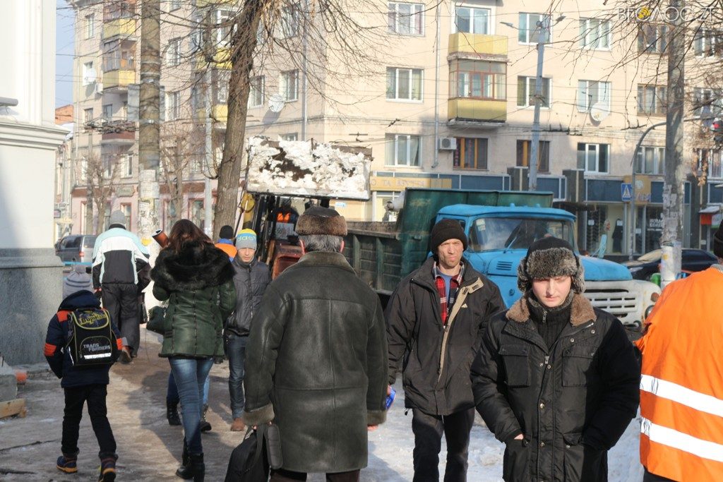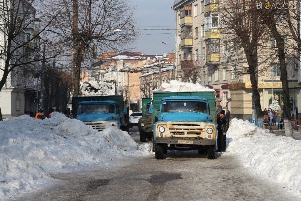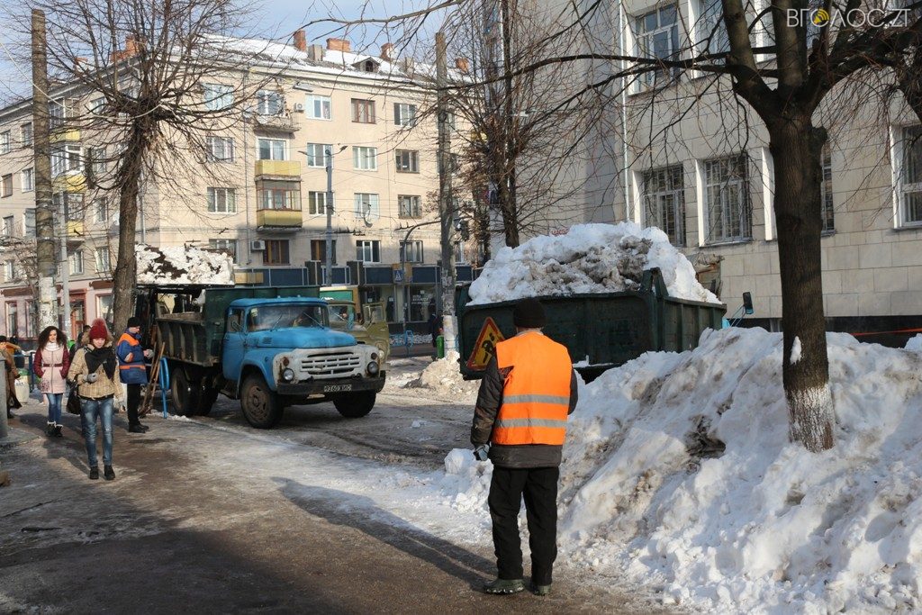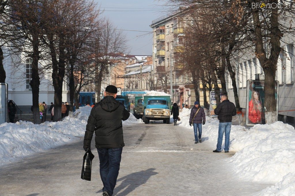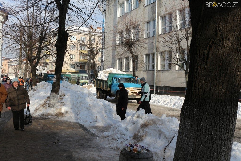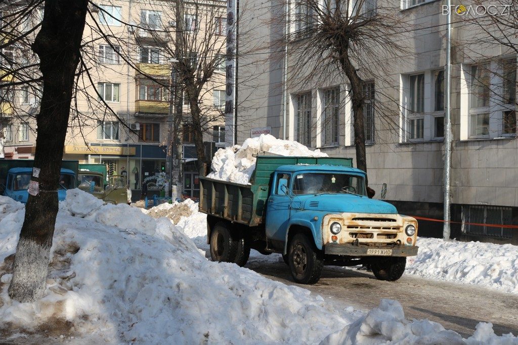 Снігові «гори», які утворилися на вулиці Михайлівській після снігопадів, комунальники почали прибирати лише 17 січня. Сніг з вулиці вивозять двома вантажівками.