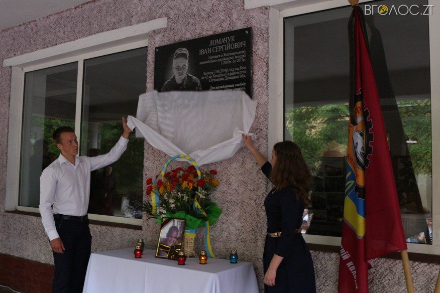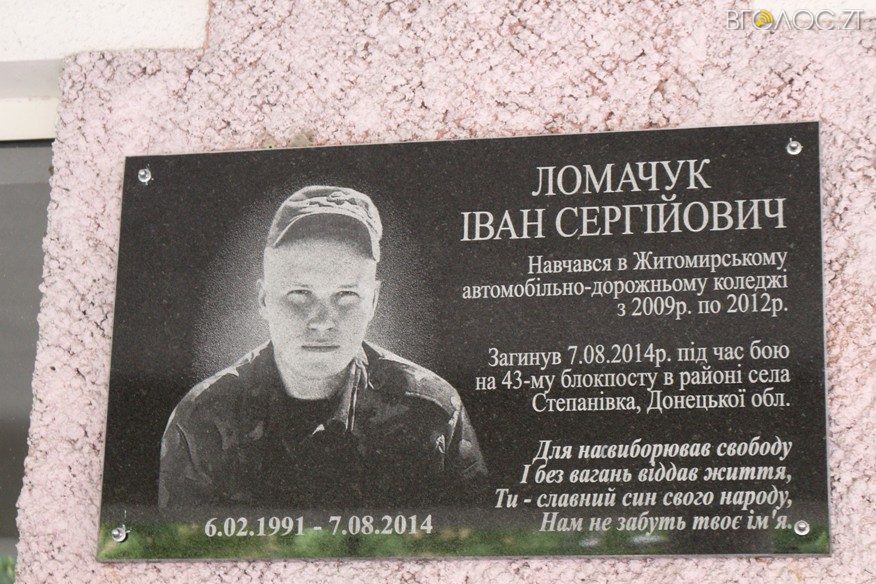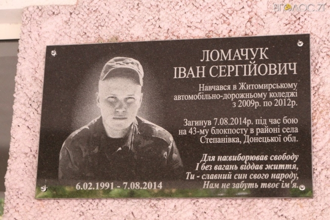 На фасаді Житомирського автомобільно-дорожнього коледжу Національного транспортного університету 23 травня відкрили меморіальну дошку загиблому бійцю АТО Івану Ломанчуку.