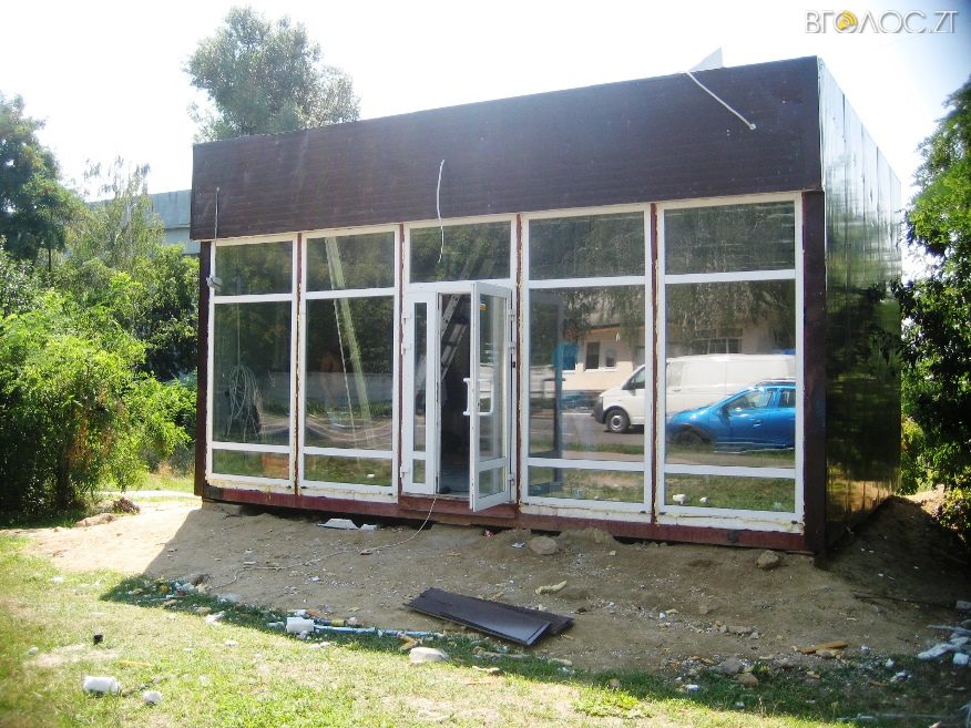 На сьогодні в районі Тетерівського бульвару завершується спорудження павільйону для торгівлі квартирами у новобудовах. На місце будівництва одна за одною їздять вантажівки із бетоном.