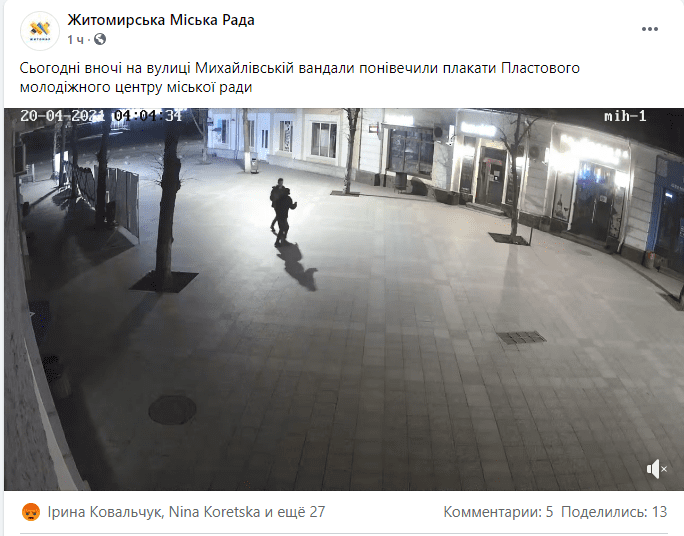 Сьогодні вночі камери відеоспостереження на Михайлівській зафіксували двох молодиків які проходили повз плакати Пластового молодіжного центру. На відео видно як хлопці спочатку пройшли повз плакати, але вирішили повернутися для того, щоб зіпсувати їх.