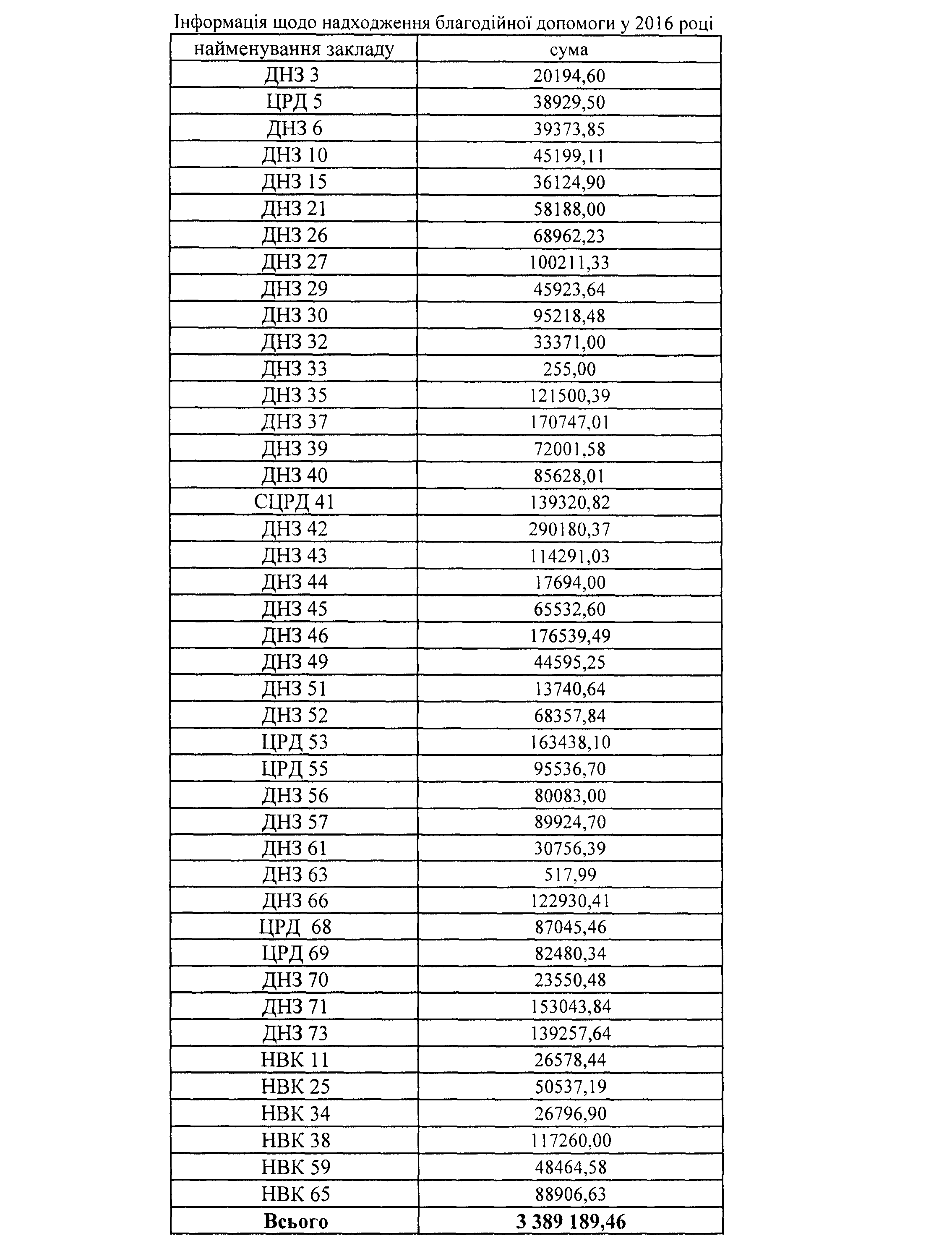 Набільше благодійної допомоги отримав ДНЗ №42 – на суму у 290 тис. 180 грн 37 коп. Найменше – дошкільні навчальні заклади №33 та № 63 – 255 грн та 517 грн 99 коп. відповідно.
