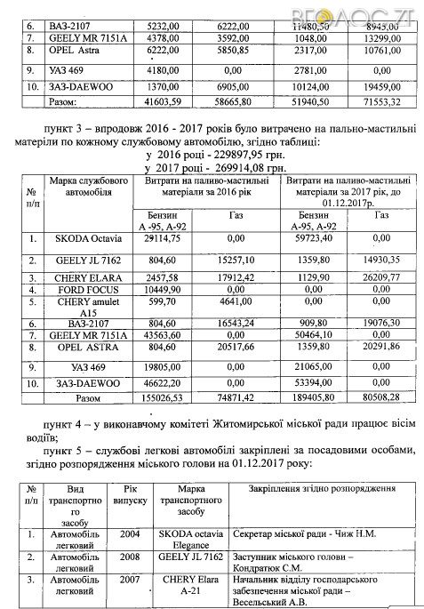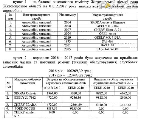 У минулому році на технічне обслуговування та паливно-мастильні матеріали для легкових службових автомобілів Житомирської міської ради витратили майже 400 тис. грн. Про це «Вголос.zt» у відповіді на інформаційний запит повідомила керуюча справами виконавчого комітету Ольга Пашко.