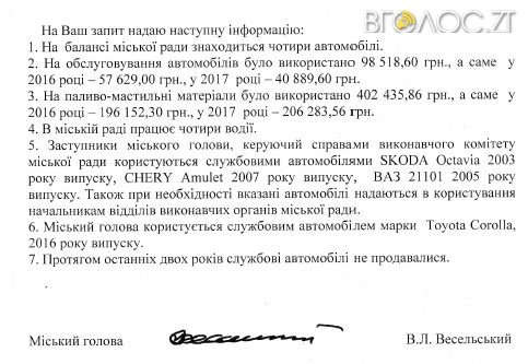 Найдорожча та найновіша автівка “дісталася” міському голові Віктору Весельському. Це – Toyota Corolla 2016 року випуску. Заступники міського голови, керуючий справами виконавчого комітету міської ради “ділять” між собою три автомобілі: Skoda Octavia 2003 року випуску, Chery Amulet 2007 року, ВАЗ 21101 2005 року випуску. Також при необхідності вказані автомобілі надаються у користування начальникам відділів виконавчих органів міської ради. Окрім того, працює у міській раді чотири водії.