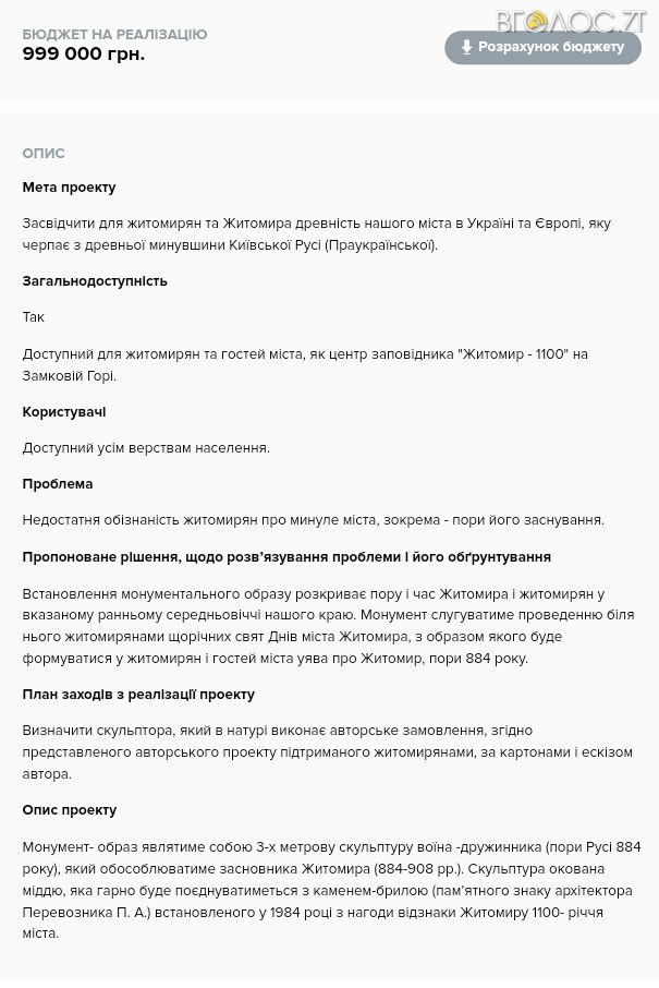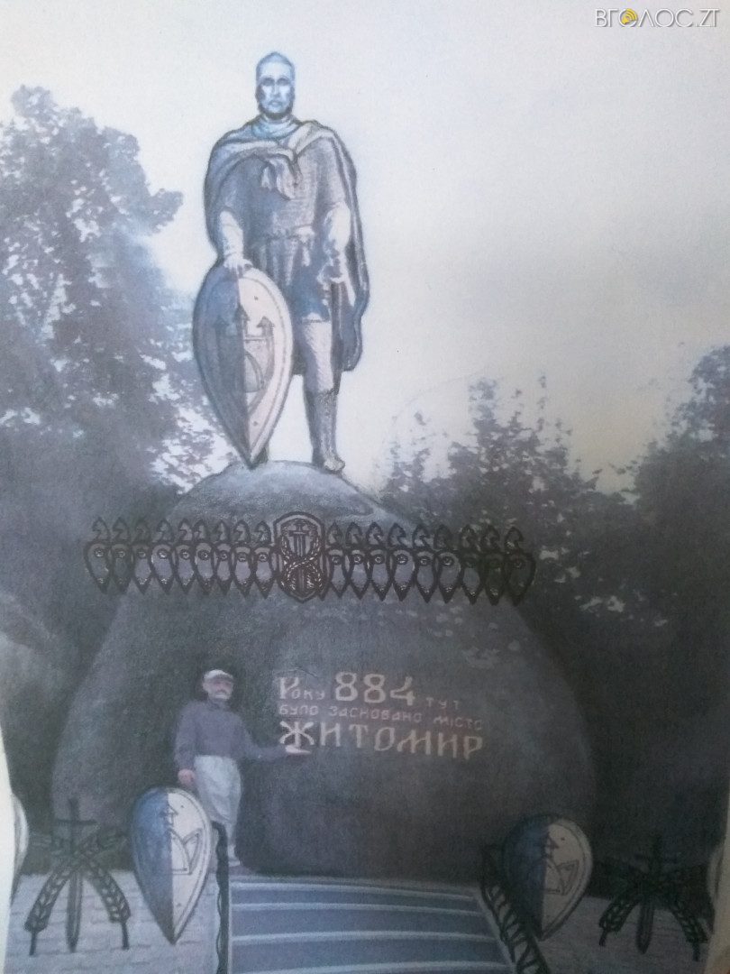 «Мета проекту – відтворити первинне Житомира на Замковій Горі в образі першого поселенця. Монумент слугуватиме проведенню біля нього житомирянами щорічних свят Днів міста Житомира, з образом якого буде формуватися у житомирян і гостей міста уява про Житомир пори 884 року. Монумент-образ являтиме собою 3-х метрову скульптуру воїна -дружинника (пори Русі 884 року), який уособлюватиме засновника Житомира (884-908 рр.). Скульптура окована міддю, яка гарно буде поєднуватиметься з каменем-брилою (пам’ятного знаку архітектора Перевозника П. А.) встановленого у 1984 році з нагоди відзнаки Житомиру 1100- річчя міста», – пояснює автор.