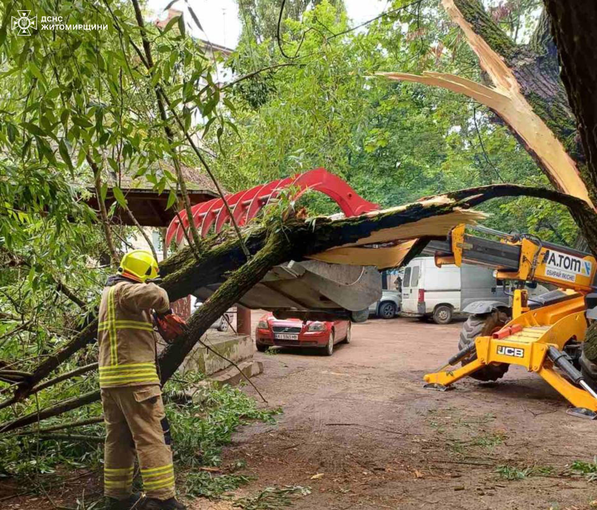Зокрема, 11 червня о 09:13 до Служби порятунку «101» надійшло повідомлення про те, що необхідна допомога рятувальників у прибиранні дерева в Коростені. Внаслідок поривів вітру гілка впала на поруч припаркований автомобіль. Бійці ДСНС спільно з місцевими жителями відтягнули її на узбіччя дороги.