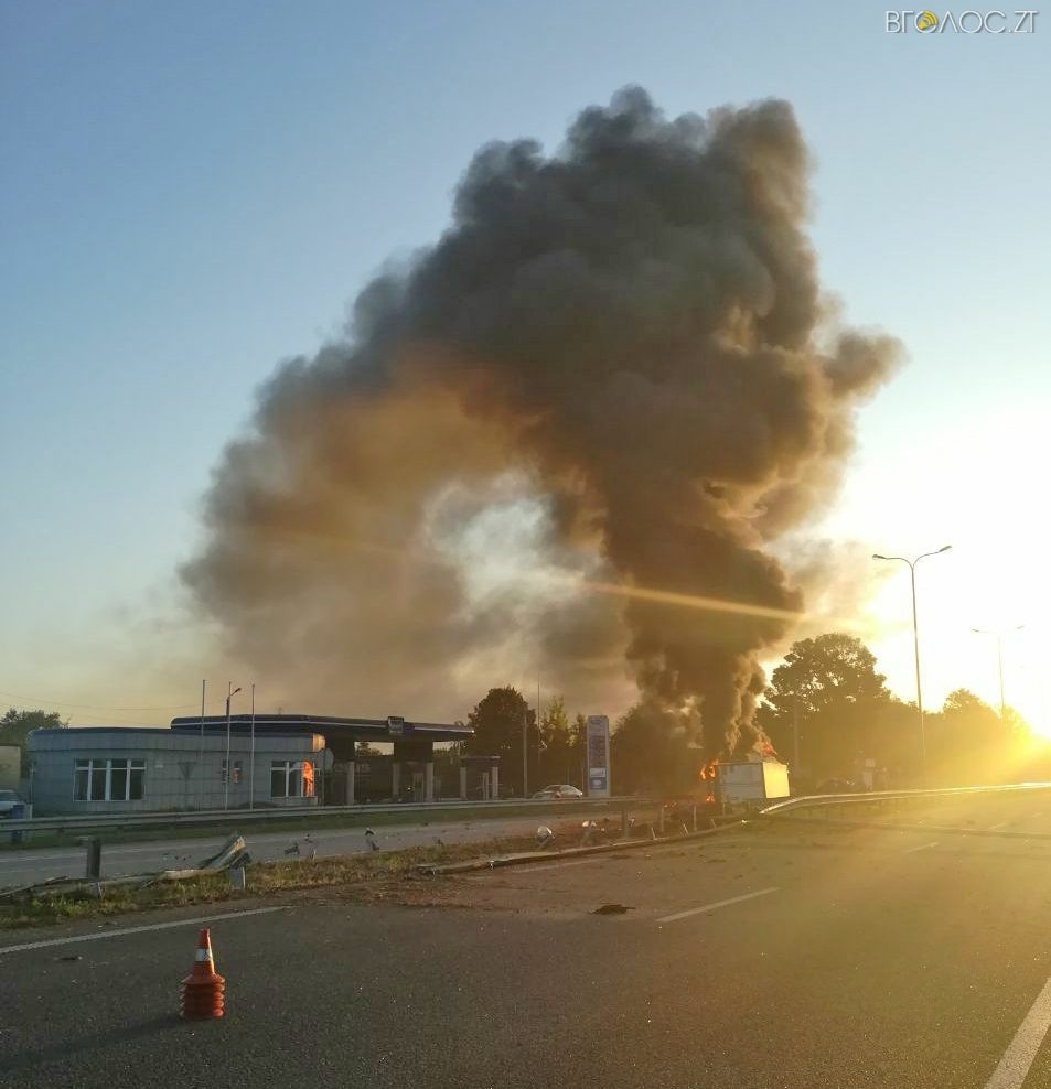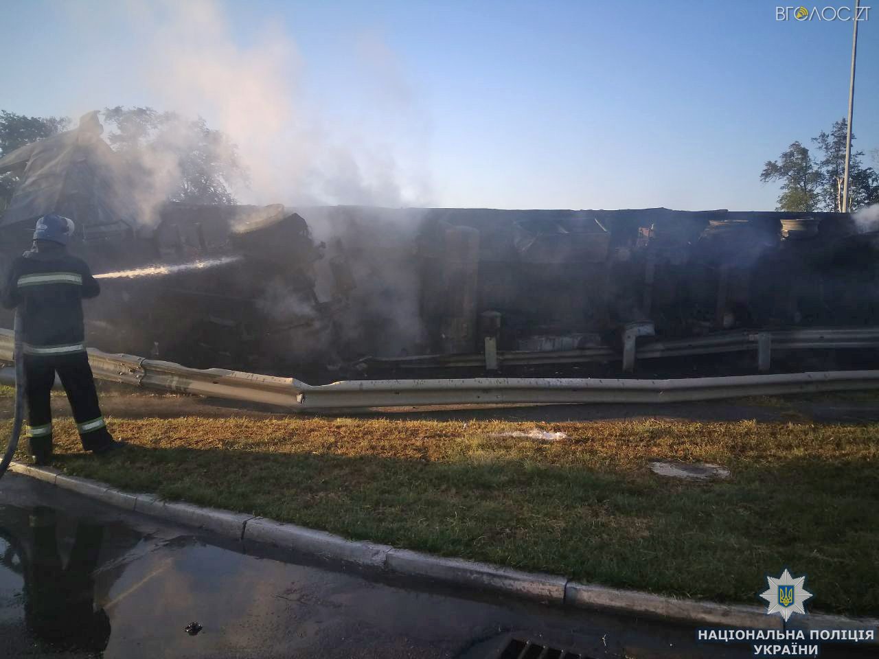 “Нині на ділянці ДТП обмежено рух транспорту. Патрульні поліцейські забезпечують організацію об’їзду місця пригоди суміжною дорогою. Також працюють  рятувальники, які ліквідовують виникле внаслідок ДТП загоряння вантажівки”, – додали у поліції.