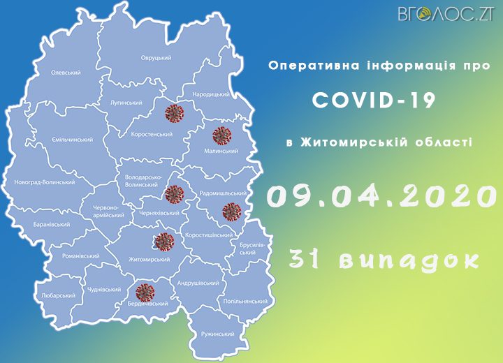 «Станом на 09.04.2020 (за минулу добу) зареєстровано 4 нових випадків (лабораторно підтверджених). Всього випадків на Житомирщині – 31», – йдеться у повідомленні лабораторного центру.