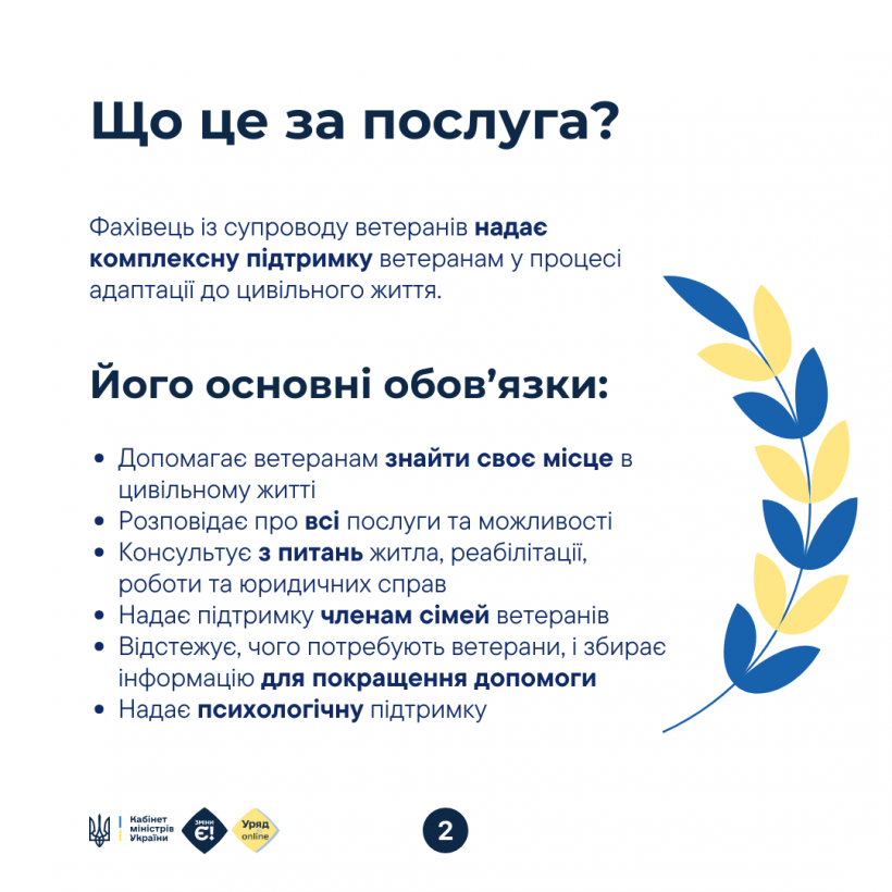 Фахівець з супроводу ветеранів надає комплексну підтримку з питань пільг, реабілітації, працевлаштування, психологічної допомоги тощо.