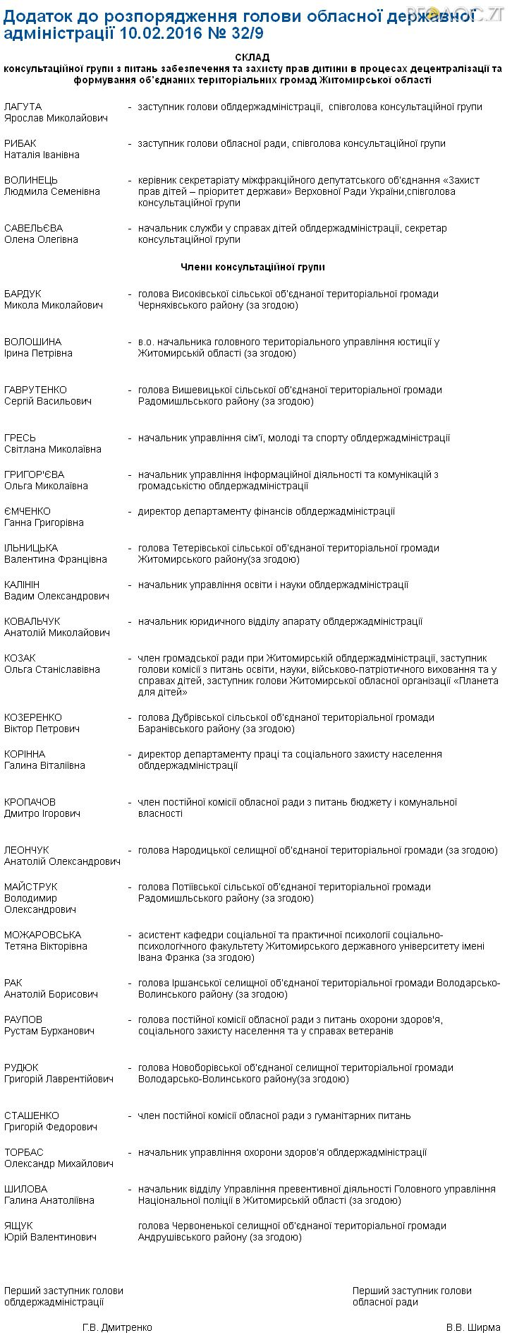 «Консультаційній групі [треба] опрацювати питання щодо особливостей виконання новоствореними об’єднаними територіальними громадами Житомирської області функцій із забезпечення та захисту прав дитини до 1 квітня 2016 року; підготувати та подати пропозиції щодо забезпечення прав дитини в ході діяльності об’єднаних територіальних громад Житомирської області до 01 вересня 2016 року облдержадміністрації та обласній раді», – йдеться також у розпорядженні.
