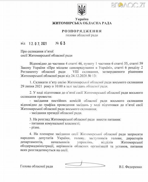 “Скликати п’яту сесію Житомирської обласної ради восьмого скликання 29 липня 2021 року о 10:00 в залі засідань обласної ради”, – йдеться в розпорядженні.