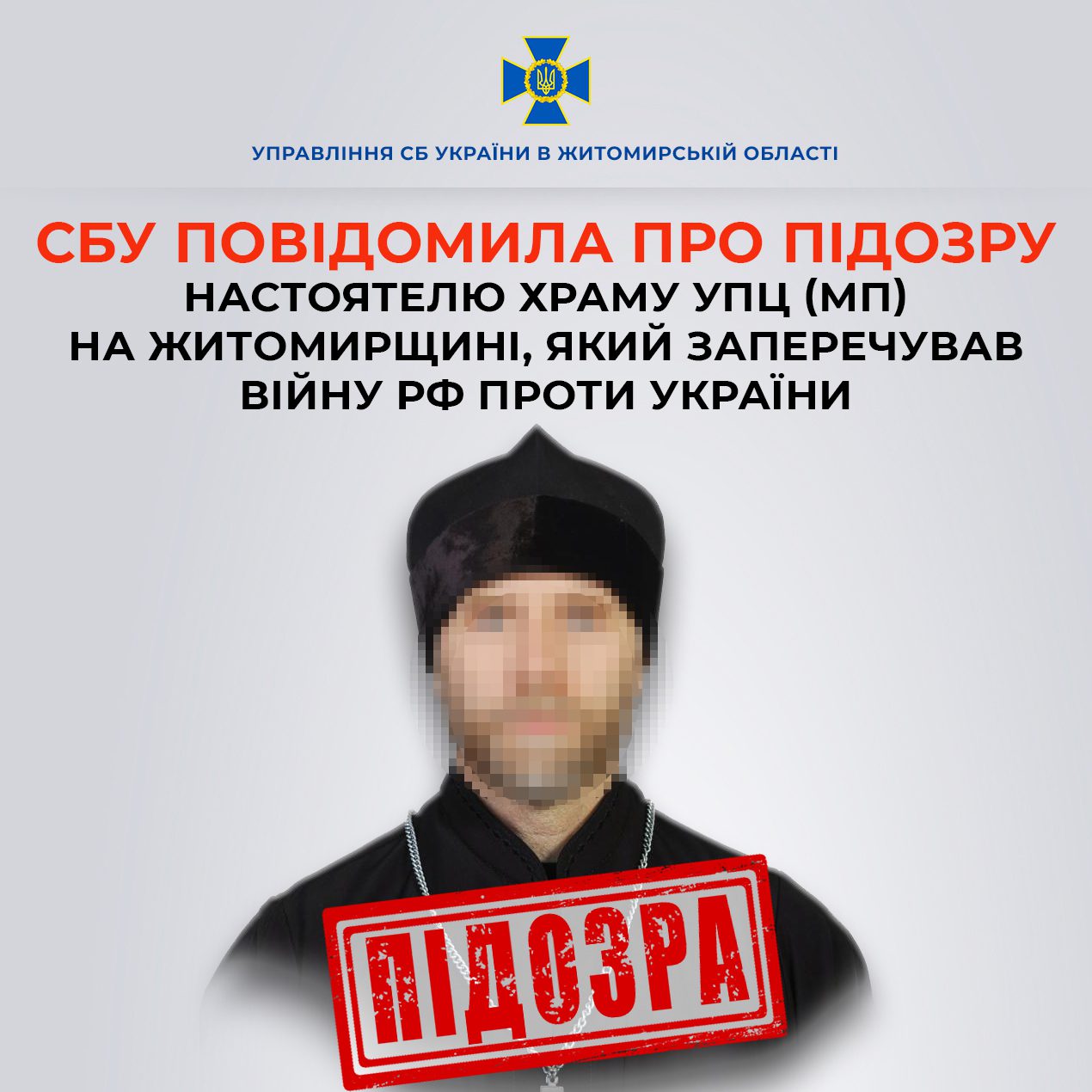 Настоятеля храму УПЦ мп поблизу Бердичева підозрюють у підтримці та поширенні наративів росії. Про це повідомили у прес-групі СБУ.