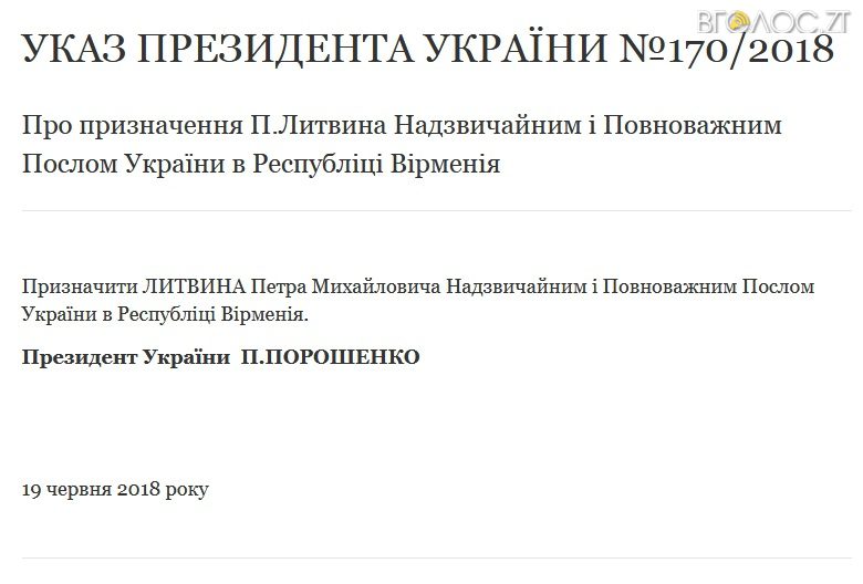 «Призначити ЛИТВИНА Петра Михайловича Надзвичайним і Повноважним Послом України в Республіці Вірменія», – йдеться у документі.
