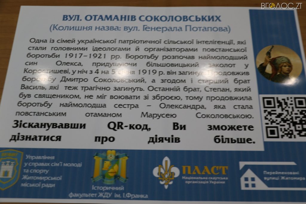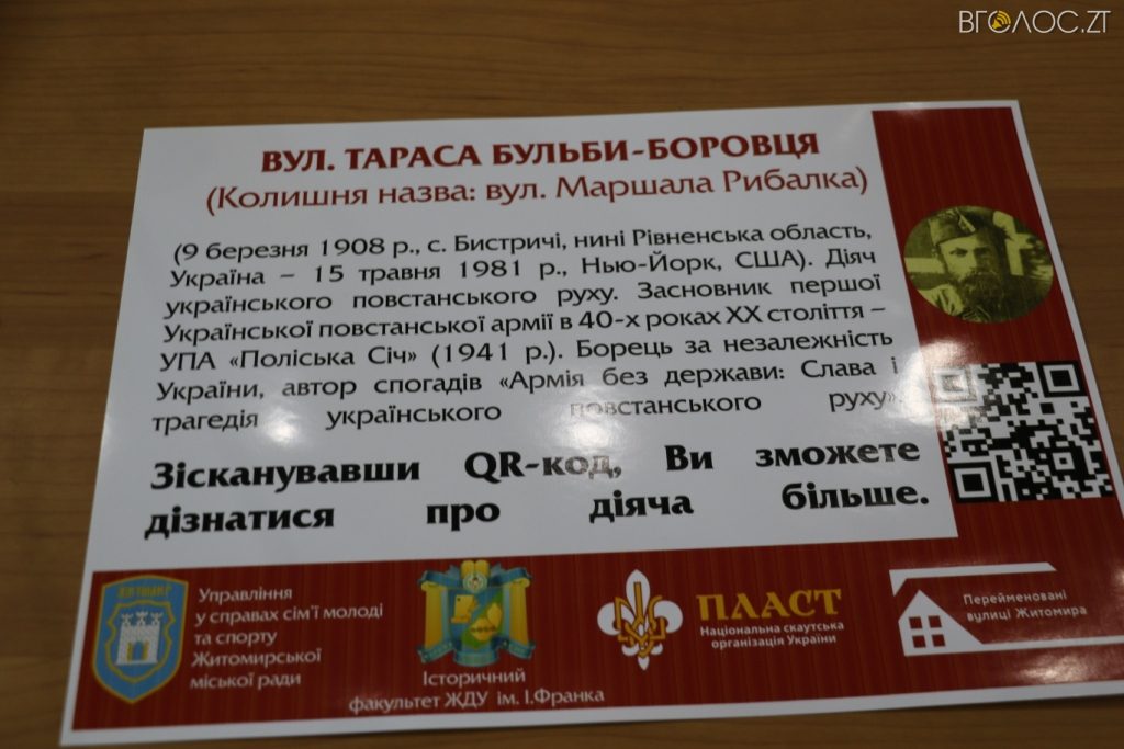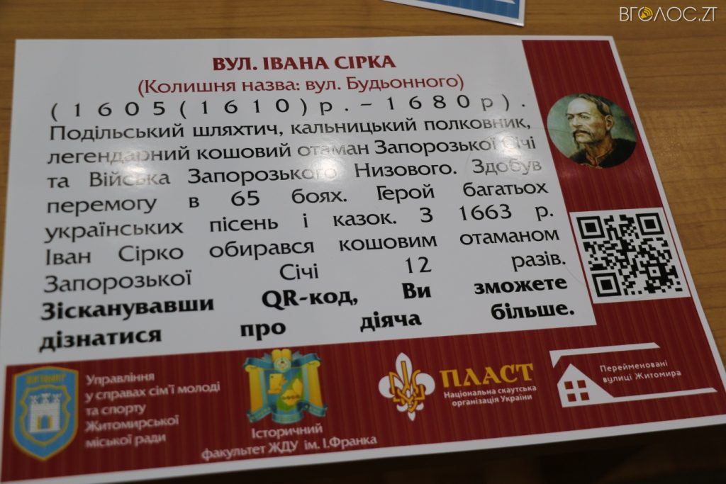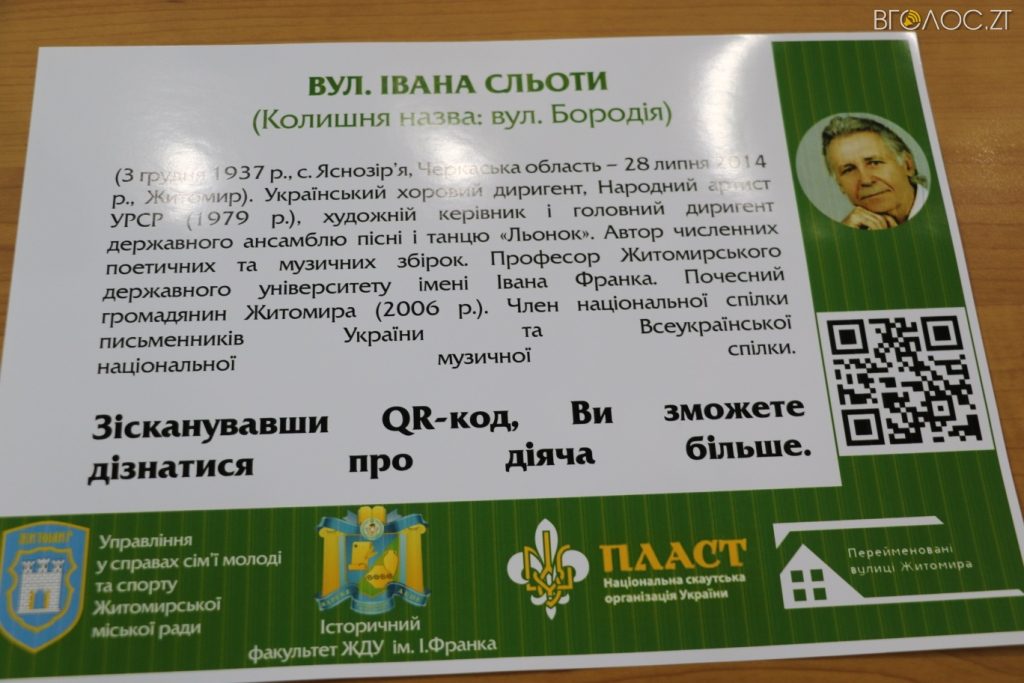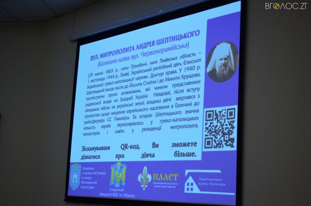 «Назви вулиць в Житомирі було змінено, проте багато містян досі не знає, на честь кого їх перейменували. Проект покликаний вирішити це питання та надати житомирянам доступну інформацію про визначних українських історичних діячів», – зазначив автор проекту студент історичного факультету ЖДУ ім. Івана Франка Олександр Шевчук.