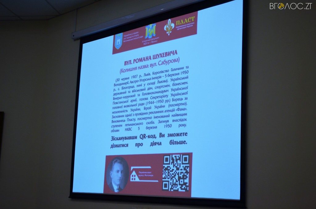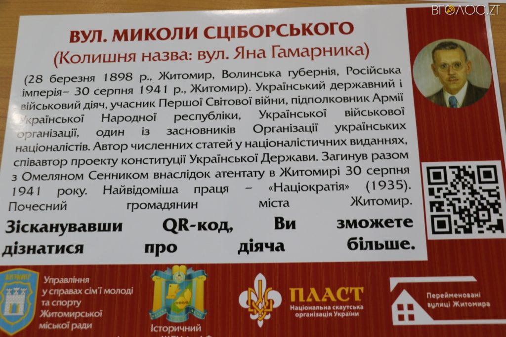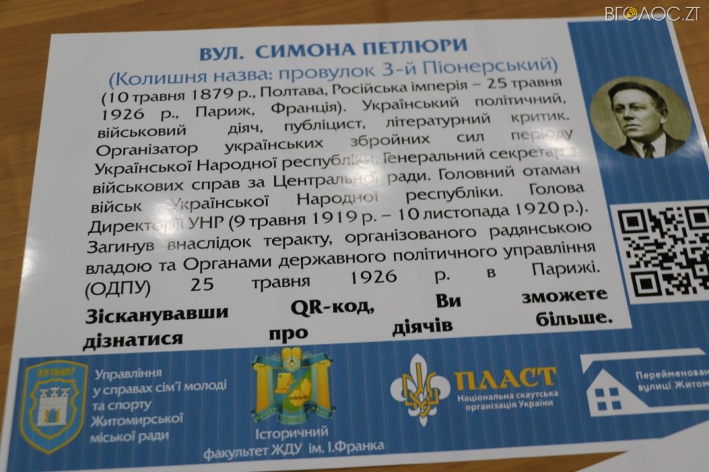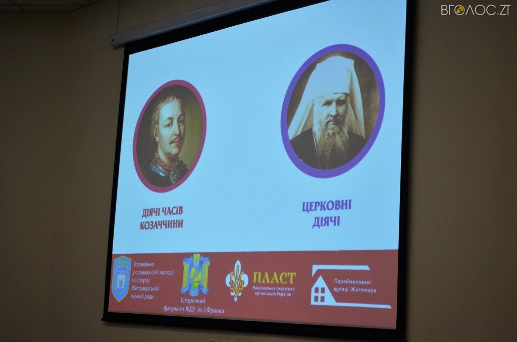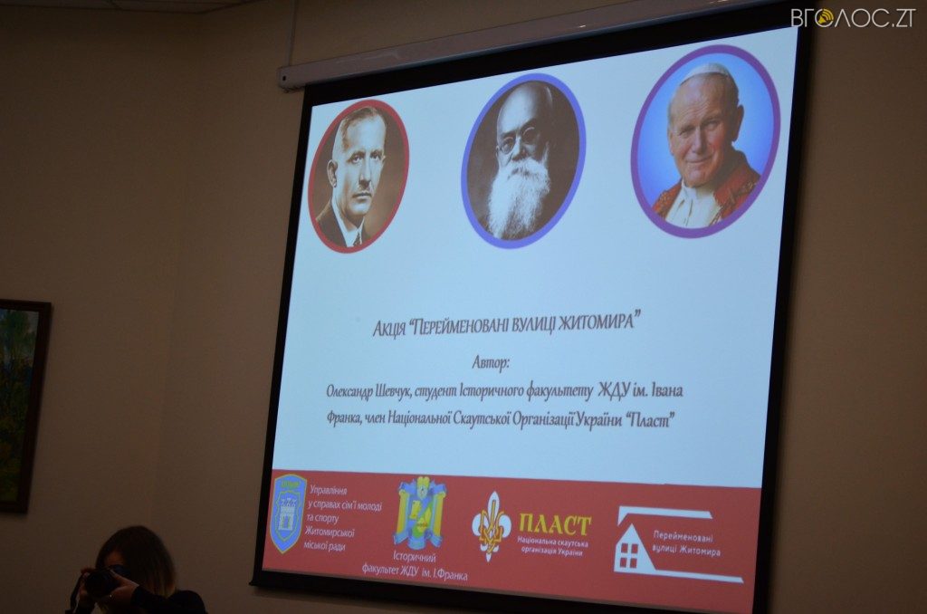 «Назви вулиць в Житомирі було змінено, проте багато містян досі не знає, на честь кого їх перейменували. Проект покликаний вирішити це питання та надати житомирянам доступну інформацію про визначних українських історичних діячів», – зазначив автор проекту студент історичного факультету ЖДУ ім. Івана Франка Олександр Шевчук.