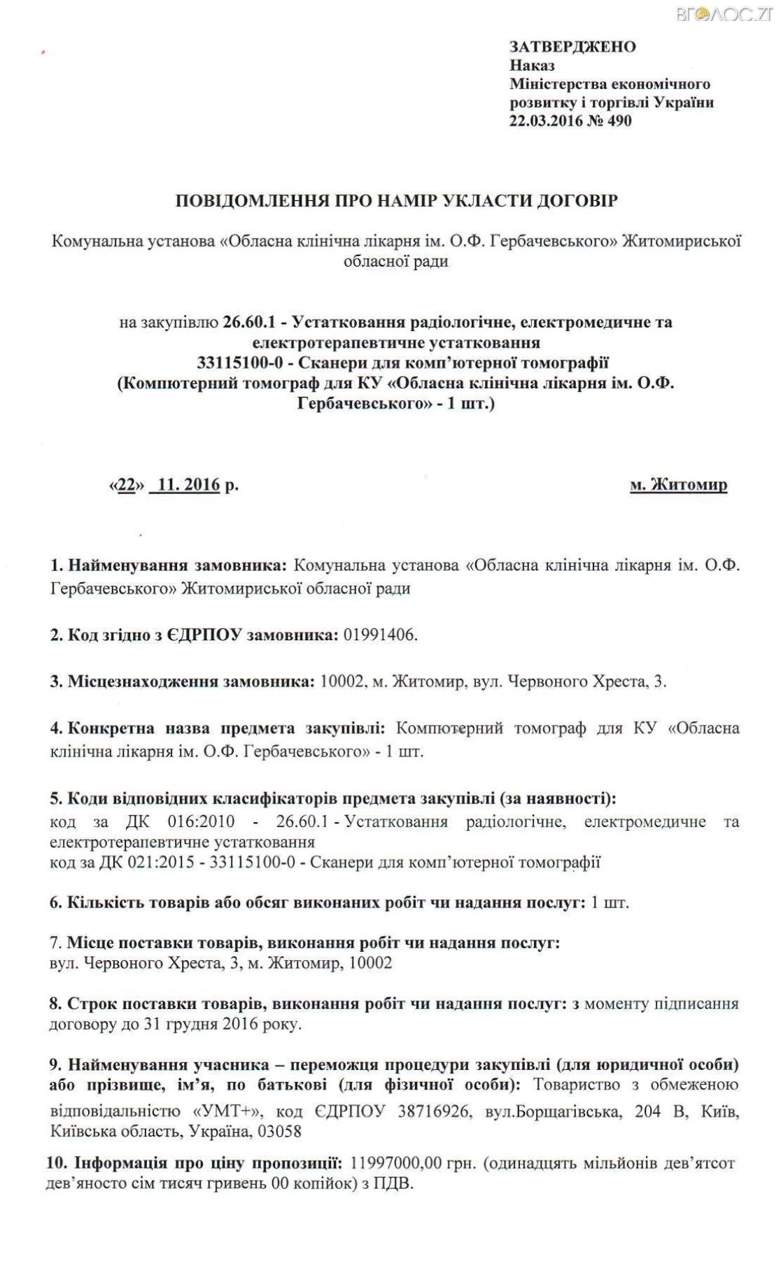 Переможцем було визначене останнє. І хоча очікувана вартість томографа була заявлена 13 млн грн з ПДВ, купуватимуть його за 11 млн 997 тис. грн. Саме таку суму запропонував переможець.