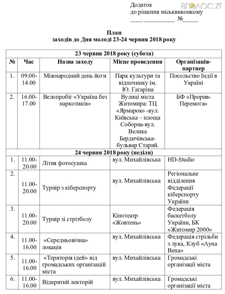 Згідно із документом, у перший день святкування програма буде не надто насиченою. Увазі житомирян і гостей запропонують день йоги та велопробіг.
