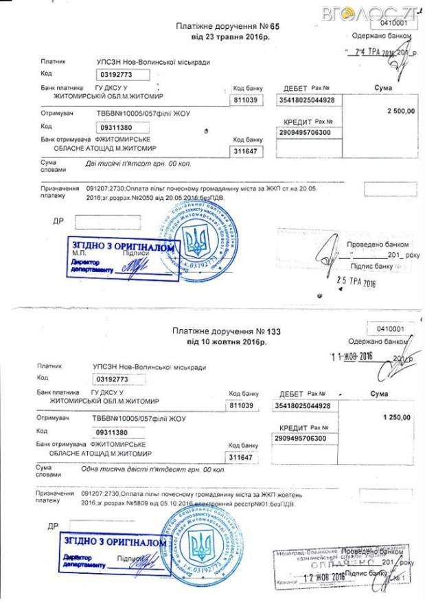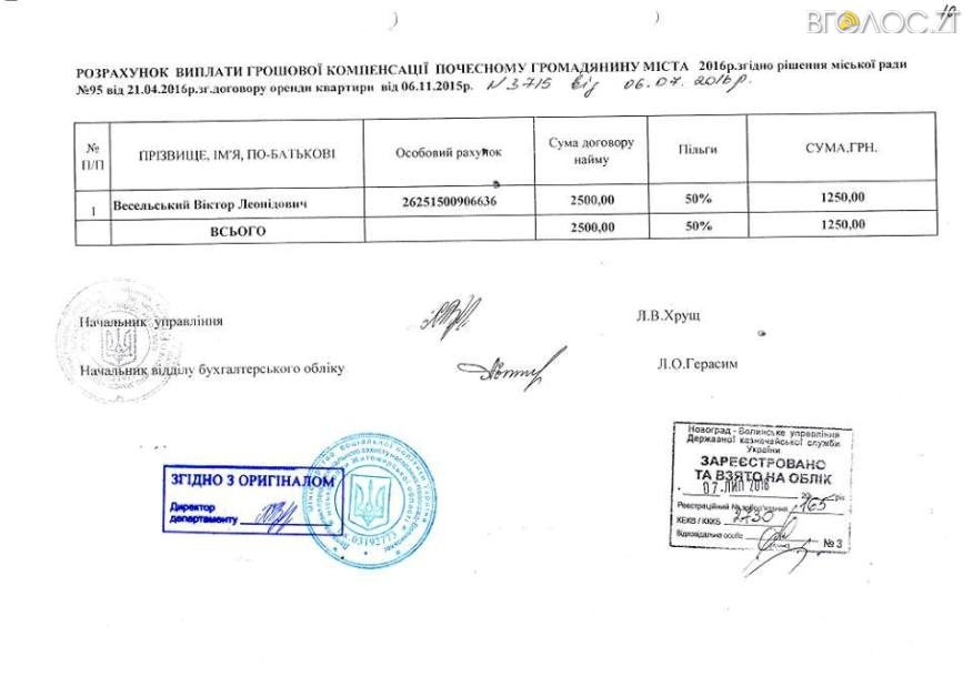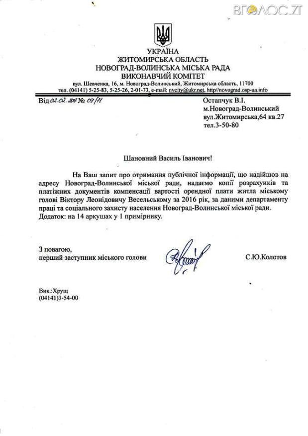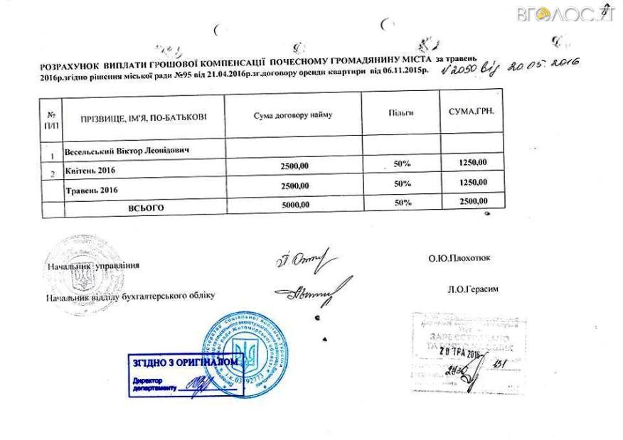 Новоград-Волинська міська рада щомісяця виплачує компенсацію у розмірі 50% від вартості орендної плати за квартиру, у якій проживає міській голова Віктор Весельський. Крім того, оплачує половину коштів за комунальні послуги міському голові. Відповідні платіжні доручення оприлюднив у соціальній мережі Facebook депутат міської ради Василь Остапчук.