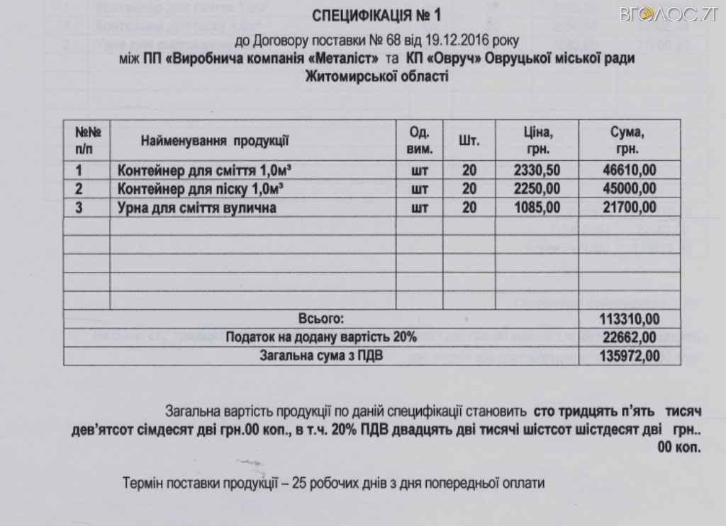 Комунальне підприємство “Овруч” Овруцької міської ради 19 грудня уклало з приватним підприємством “Виробнича компанія «Металіст» два окремі договори на загальну суму 287 тис. 292 грн. Кожен із них містив “допорогову” закупівлю, що дало можливість уникнути відкритого аукціону.