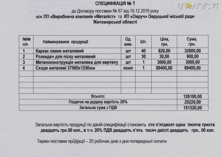 Овруцька міська рада знову купує у приватної фірми, яка належить дружині голови Овруцької райдержадміністрації Юрія Дивинського, металеві конструкції майже на 300 тис. грн.