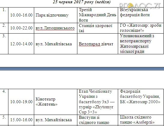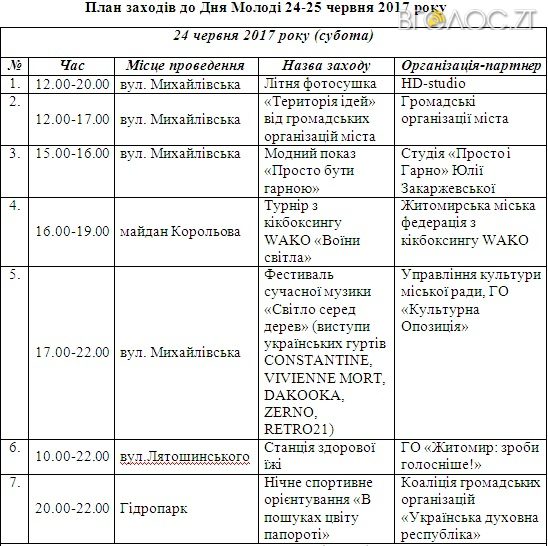 Патріотичні, спортивні та громадські заходи проведуть у Житомирі до Дня молоді упродовж 24 – 25 червня. Відповідне рішення прийняли члени виконкому під час засідання 21 червня.