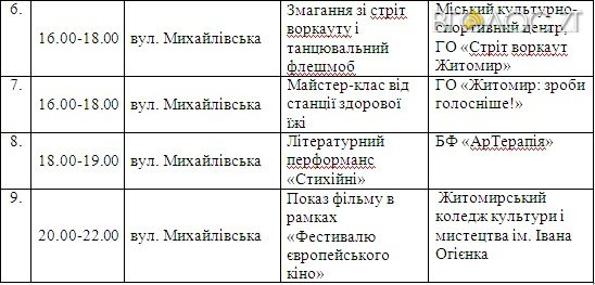 «Дуже яскравим буде шоу – патріотичне і на честь 95-ї бригади – «Воїни світла», де буде задіяна військова техніка, а спортсмени змагатимуться на рингу з кікбоксингу. У кінці дня з 17-ї до 22-ї години у нас буде фестиваль сучасної музики на вулиці Михайлівській, в якому будуть задіяні українські гурти», – повідомила Ірина Ковальчук.