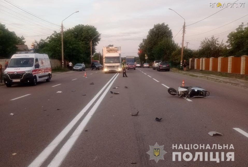 “Попередньо, водій автомобіля «Iveko», 61-річний житомирянин, рухаючись у напрямку обласного центру, вчинив зіткнення з мотоциклом «Honda Lead» під керуванням 19-річної місцевої жительки, яка рухалась попереду автівки”, – йдеться у повідомленні.