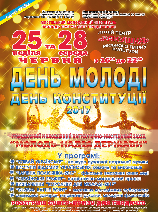 У Житомирі 25 та 28 червня у літньому театрі “Ракушка” заплановано ряд молодіжних заходів до Дня молоді та Дня Конституції України.