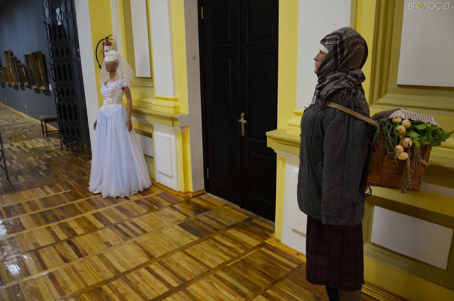 Уже у холі приміщення ми зустрічаємо двох жінок-манекенів: одна – спрацьована жінка, інша – панянка у весільній сукні. Що це? Контраст світів і поглядів чи натяк на те, що час усе змінює?
