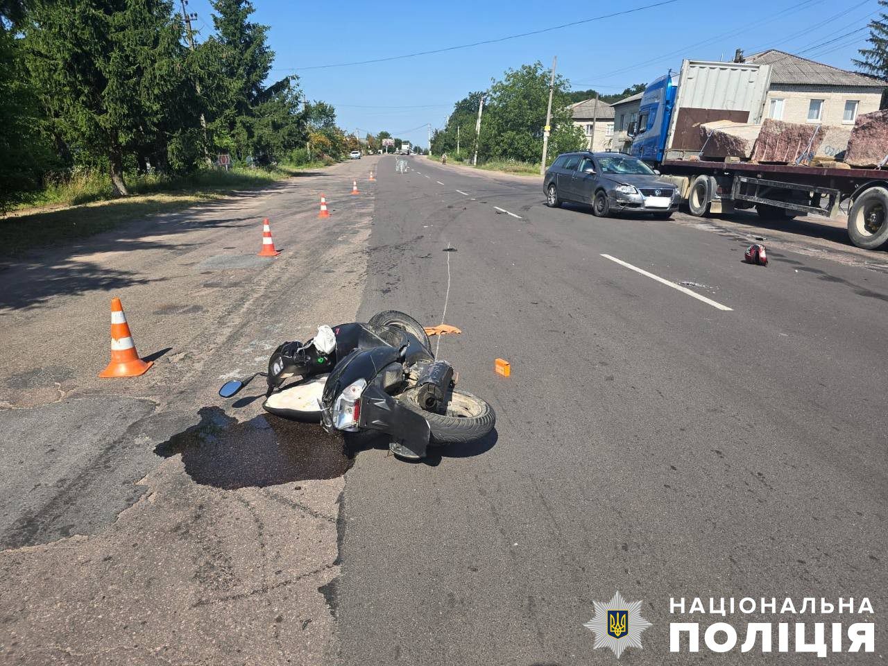 Через ДТП у смт Хорошів Житомирського району, яке сталося 12 липня, травмувався 74-річний водій скутера. Про це повідомили у прес-службі поліції області.