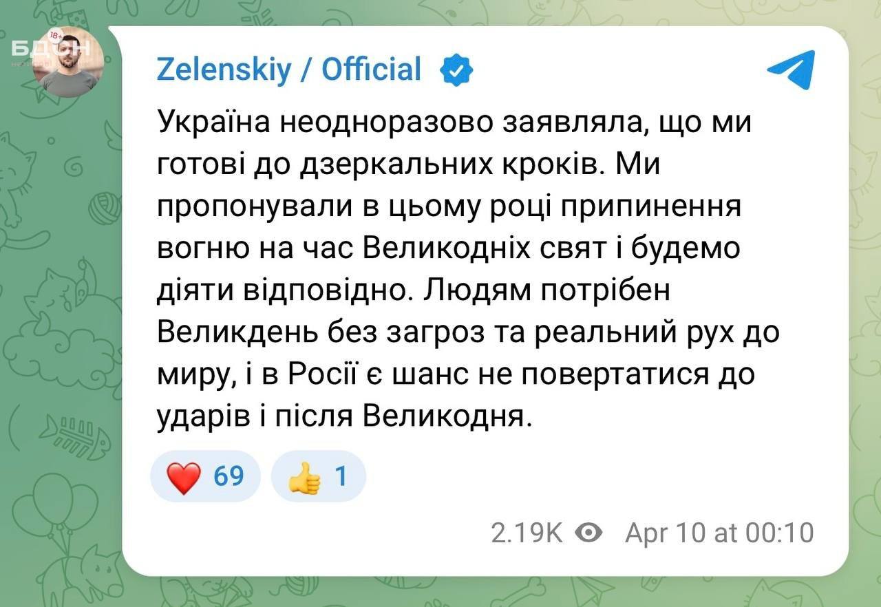 Президент України Володимир Зеленський заявив, що країна готова до дзеркальних кроків у відповідь на оголошене Путіним «великоднє перемир’я».