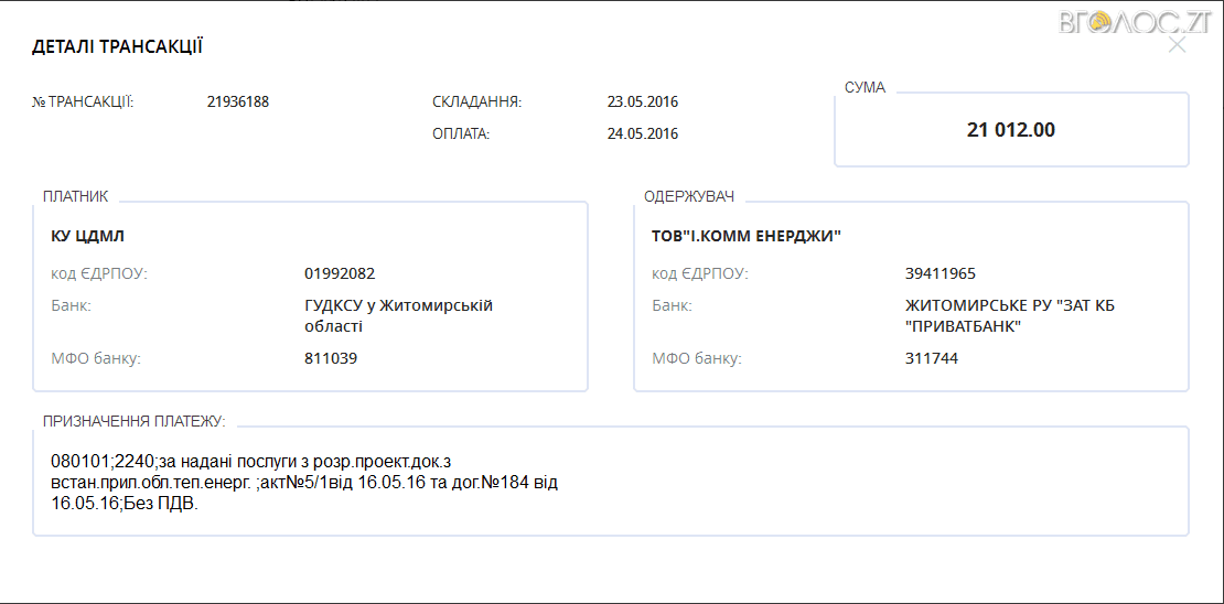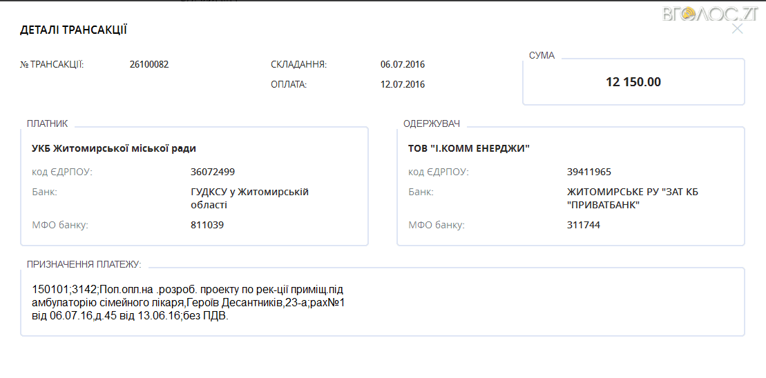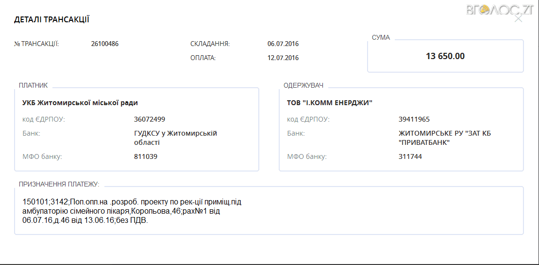 Майже двадцять шість тисяч гривень за один день – 12 липня – перерахувало управління капітального будівництва Житомирської міської ради ТОВ «І. Комм Енерджи» на розробку проектної документації для амбулаторій сімейного лікаря на вулицях Корольова, 46 та Героїв Десантників, 23а.