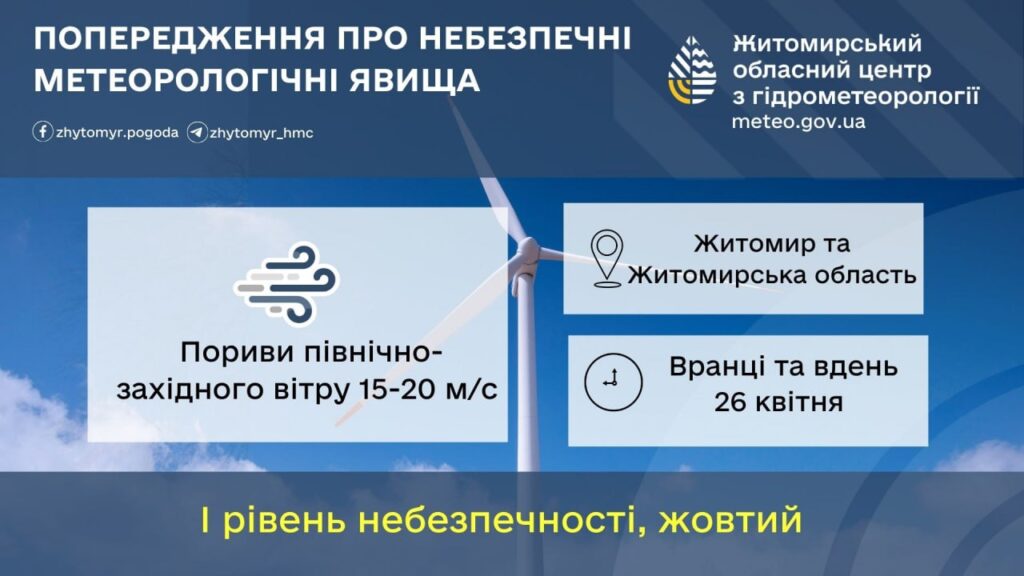 Вранці та вдень 26 квітня по Житомирській області та місту Житомиру пориви північно-західного вітру 15-20м/с ( І рівень небезпечності – жовтий).