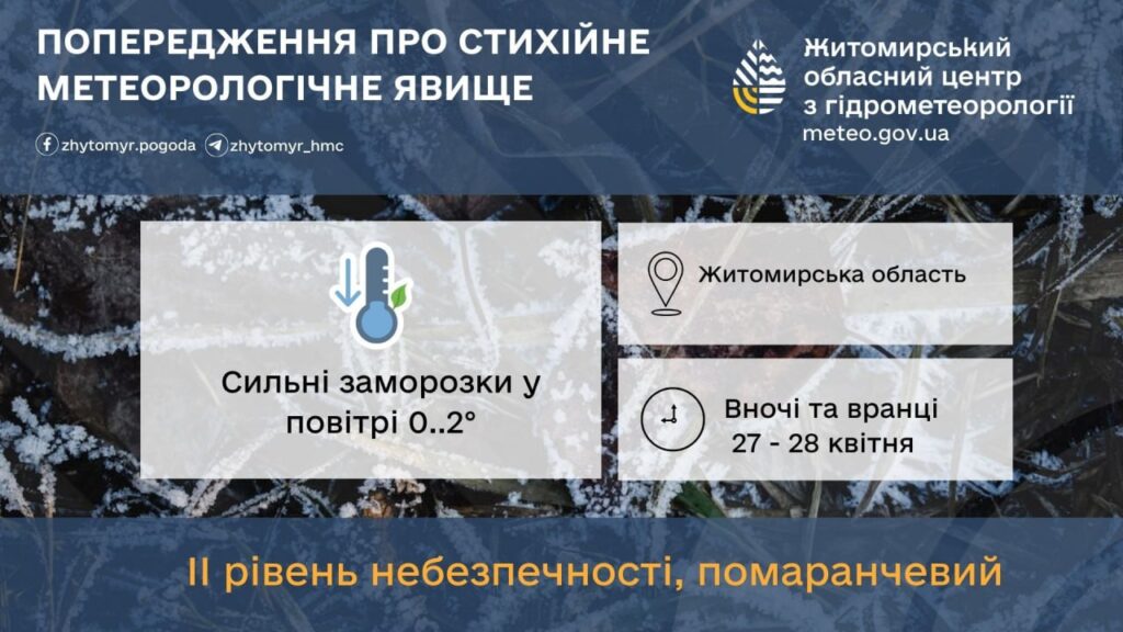 Вночі та вранці 27 – 28 квітня по Житомирській області сильні заморозки у повітрі 0..2° (ІІ рівень небезпечності – помаранчевий).