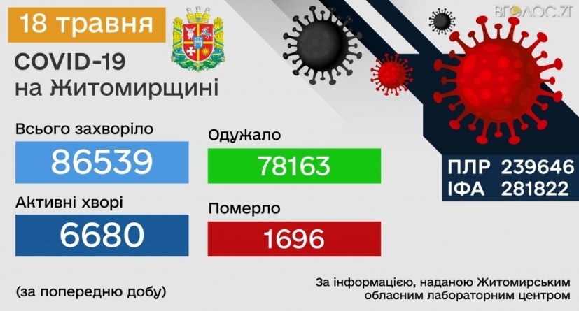 Станом на 18 травня всього на Житомирщині було зафіксовано 86 тис. 539 випадків захворювання на коронавірус. Із них одужали 6 тис. 680 осіб.