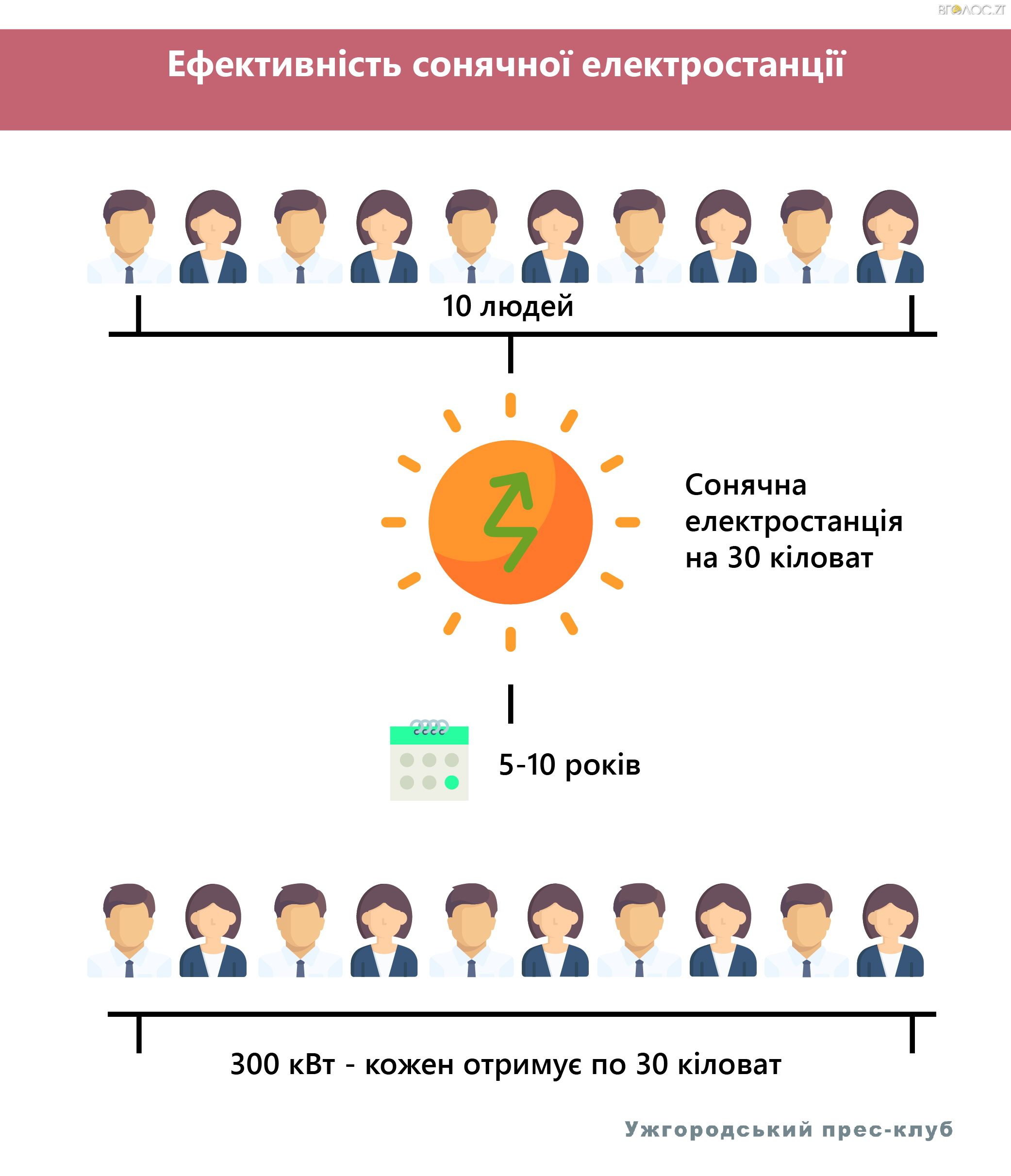 «Це, фактично, є проривом, бо дасть можливість людям, які не можуть самостійно поставити собі таку «домашню сонячну електростанцію», об’єднатися. Люди зможуть заробляти і нарощувати свої потужності. Наприклад, 10 людей, поставили першу станцію на 30 кіловат, то через 5-10 років, уже у кожного з них може бути про 30 кіловат, що в сумі це вже буде давати 300», – каже пані Оксана.