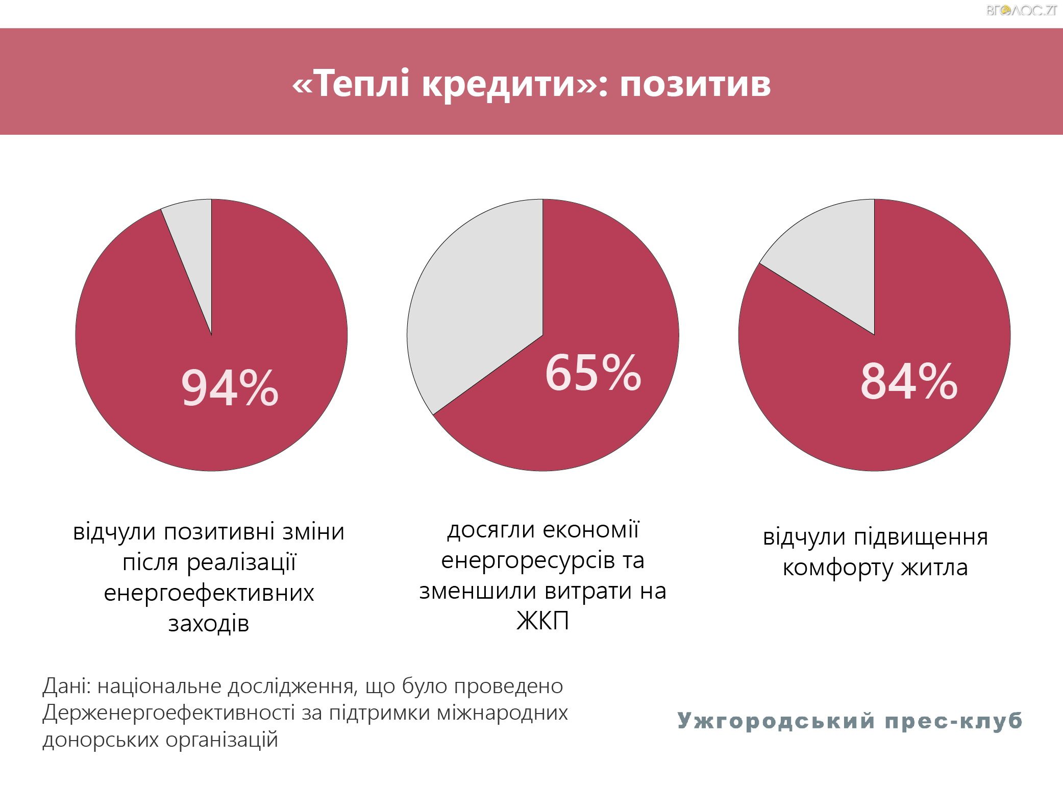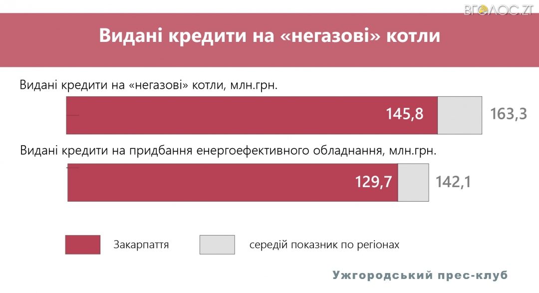 Це – єдина, поки що, державна програма підтримки населення у напрямку до раціонального використання ресурсів. Тетяна Бойко наводить дані Держенергоефективності врамках цієї програми: станом на 17 липня середній показник по регіонах з розподілу загального обсягу виданих кредитів на придбання «негазових» котлів, енергоефективногообладнання/матеріалівдля фіз. осіб, ОСББ/ЖБК становив ≈163,3 млн. грн. Закарпатська область, зокрема, має такий середній показник на рівні145,81млн. грн. Згідно з регіональним розподілом загального обсягу виданих кредитів населенню на придбання енергоефективногообладнання/матеріалів станом на 17 липня 2017 Закарпатська область, за словами експерта, не є серед лідерів, але середній показник, що становить 129,7 млн грн, є близьким до середнього показника по регіонах (≈ 142,1 млн грн).