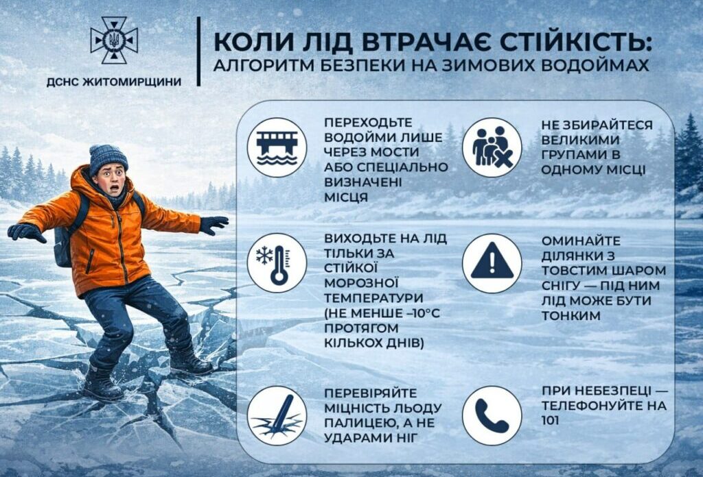 Сьогодні мінус — завтра плюс. Погода змінюється, а разом із нею слабшає й лід. Зовні він може виглядати надійним, але всередині вже крихкий. Один крок — і під ногами вже тріщить крига.