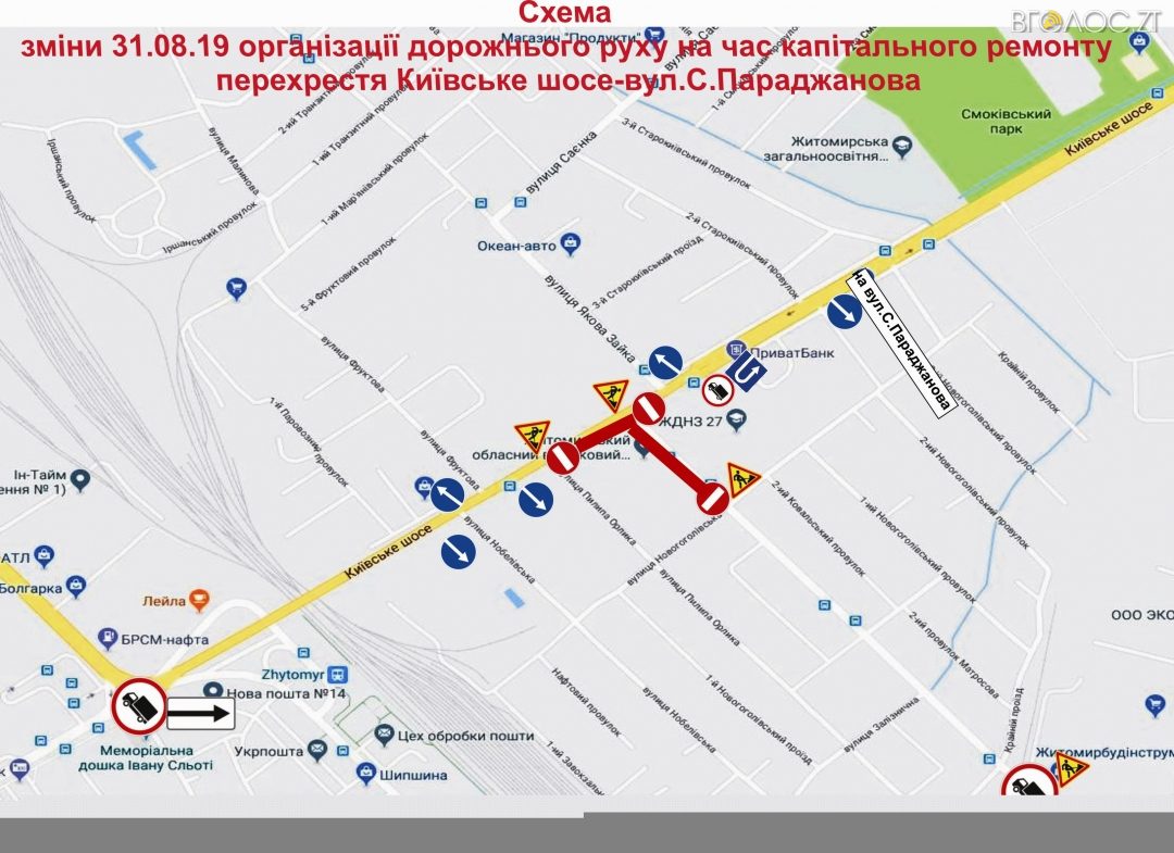 «У зв’язку із проведенням 31 серпня робіт з капітального ремонту перехрестя Київського шосе – вул. С. Параджанова, рух транспорту на даному відрізку дороги буде призупинено. Рух автобусів за маршрутами №№ 8, 19, 19-А буде перенаправлено в об’їзд по вул. Вітрука та вул. Корольова», ‒ йдеться у повідомленні.