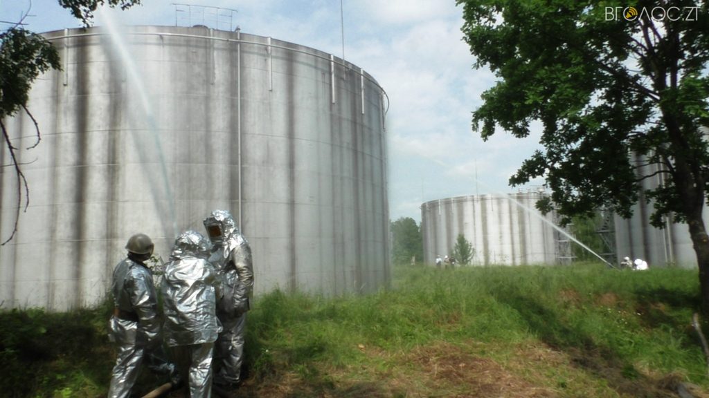 «За тактичним задумом, у результаті порушення технологічного процесу стався вибух із подальшим загоранням одного резервуару з нафтопродуктами. Помітивши загоряння, черговий охоронець повідомляє про нього керівництво та «Службу порятунку», відправляє на стримування вогню добровільну пожежну дружину нафтобази та приймає заходи щодо евакуації людей у безпечні зони. До приїзду вогнеборців ДПД намагається стримувати вогонь, однак масштаб пожежі через горючість нафтопродуктів та його великий об’єм не дозволяє ліквідувати загоряння власними силами. По приїзду підрозділи ДСНС проводять розвідку місця події і встановлюють, що горить резервуар ємністю в 5 тис. куб. м. Неподалік нього розташовані ще декілька аналогічних резервуарів, що можуть вибухнути у будь-який момент. Одночасно з гасінням осередку пожежі, рятувальники приступають до охолодження прилеглих резервуарів, щоб упередити їх загоряння. Крім того, ними проводиться оперативне розгортання та по пожежній авто драбині, за допомогою піно генератора, подається на палаючий резервуар повітряно-механічна піна. Врешті решт бійці ДСНС зупиняють розповсюдження полум’я та ліквідують пожежу», – йдеться у повідомленні.