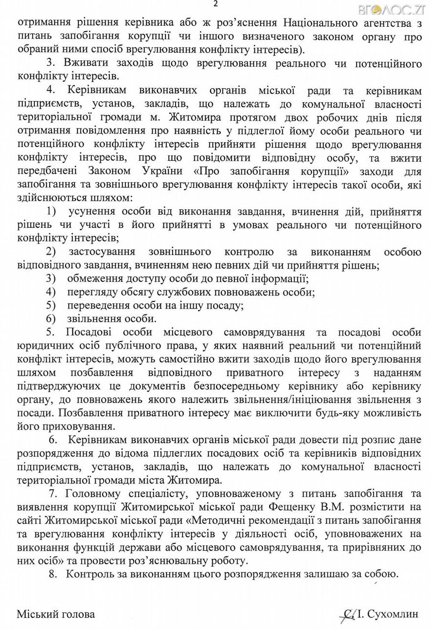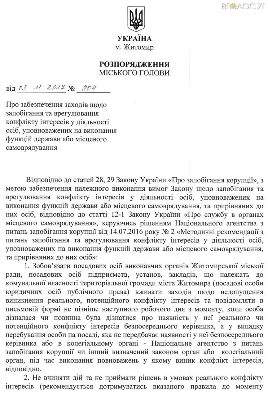Міський голова Житомира Сергій Сухомлин видав розпорядження щодо запобігання наявності конфлікту інтересів серед своїх підлеглих. Відповідний документ датований 3 листопада.