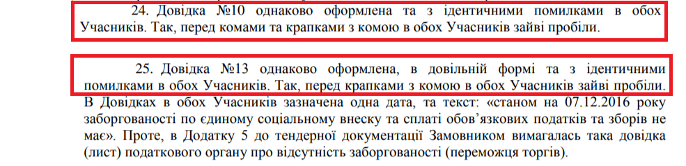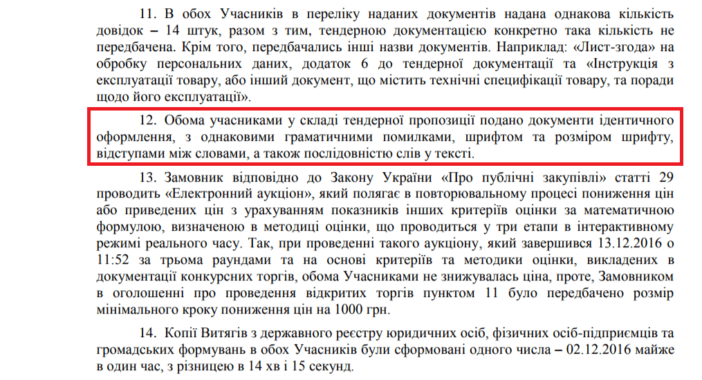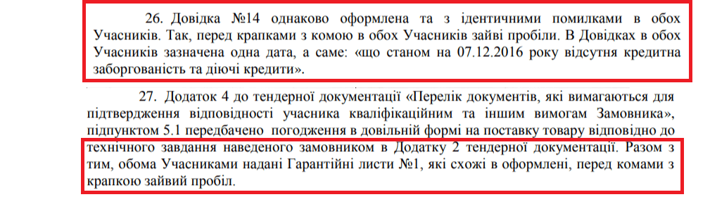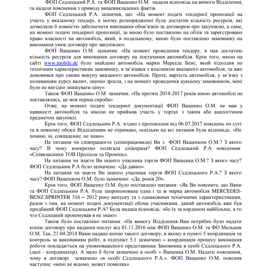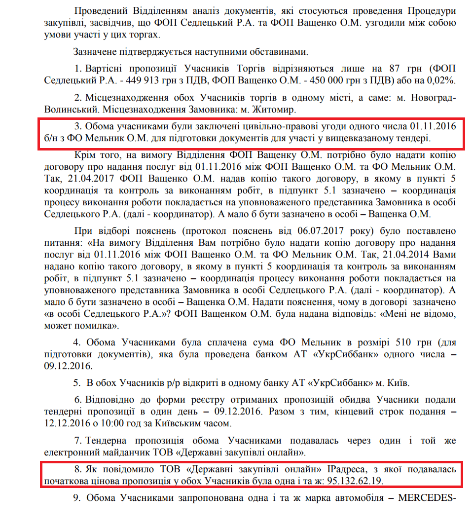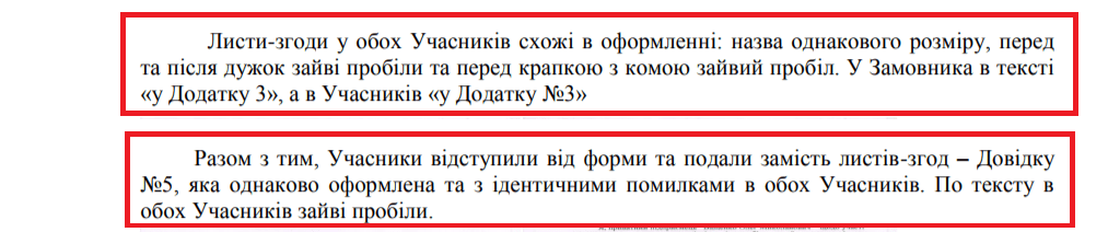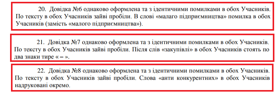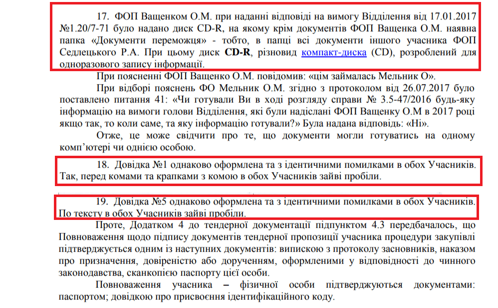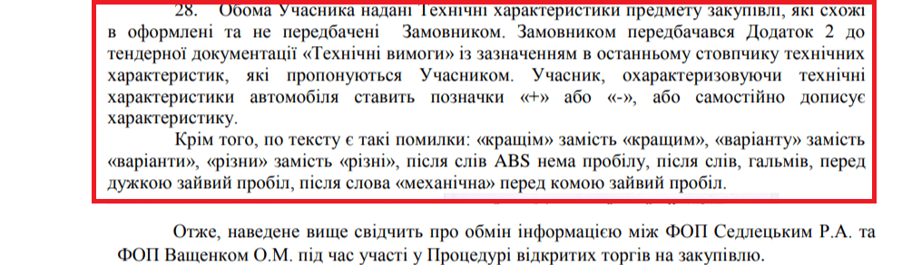 На чому ж погоріли «любі друзі»? Таких промахів в «антимонопольному» назвали майже три десятки. З основного – учасники винайняли людину, яка обом готувала документи для участі в тендері. За цю послугу їй сплатили по 510 грн. Обидва учасники подали тендерні пропозиції в один день. IP-адреса з якої подавали початкову цінову пропозицію, у Ващенка та Седлецького була одна і та ж: 95.132.62.19. Обидва запропонували одну і ту ж марку автомобіля з однаковими технічними характеристиками (на момент подачі документів у Олега Ващенка цього автомобіля у наявності не було). Документи подали ідентичного оформлення, з однаковими граматичними помилками, шрифтом та розміром шрифту, відступами між словами, а також послідовністю слів у тексті. Серед помилок: «кращім» замість «кращим», «варіанту» замість «варіанти», «різни» замість «різні», «малаго підприємництва» замість «малого підприємництва» ітд.