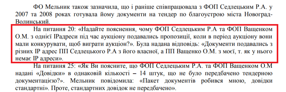 Скандально відомі депутати Новоград-Волинської міської ради Олег Ващенко та Роман Седлецький домовилися і спотворили результати тендеру, порушивши законодавство про захист економічної конкуренції. За антиконкурентні узгоджені дії, які призвели до спотворення результатів торгів, територіальне відділення Антимонопольного комітету України обох горе-підприємців оштрафувало на суму у понад 100 тис. грн. Днями у територіальному відділені оприлюднили цікаві деталі справи: «змовники» подали на конкурс усі документи з однаковими граматичними помилками та з однієї IP-адреси.