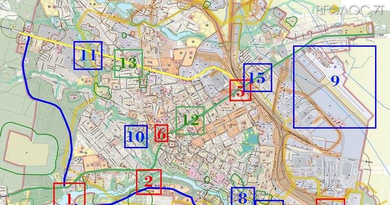 * червоним кольором – нові об’єкти, синім – реконструкція існуючих, зеленим – реконструкція шляхів