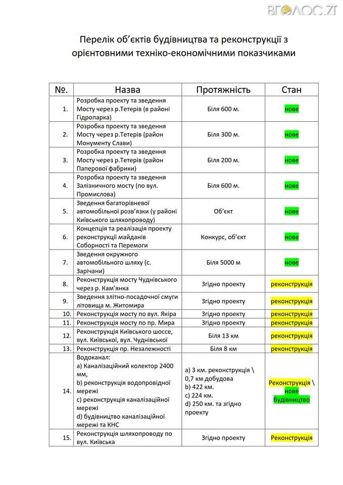 На території Житомира запланована реконструкція та будівництво деяких об’єктів. Зокрема, зведення нових та реконструкція існуючих мостів, зведення окружного автомобільного шляху та злітно-посадочної смуги, реконструкція та добудова водопровідної мережі. Про це повідомив департамент містобудування та земельних відносин на своїй сторінці у facebook.
