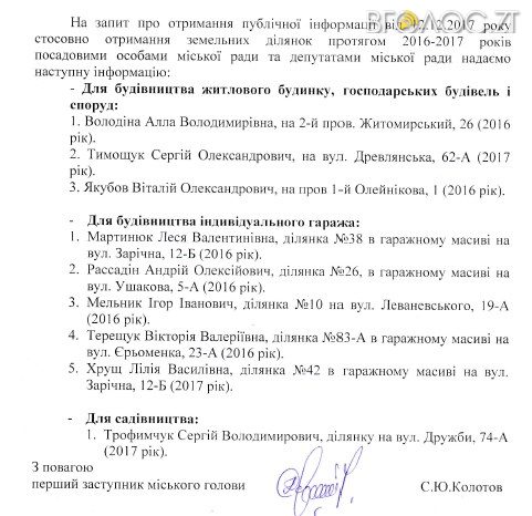 Протягом 2016-2017 років 6 посадовців Новоград-Волинської міської ради та 3 депутати отримали у власність земельні ділянки. Про це у відповіді на інформаційний запит «Вголос.Zt» повідомив перший заступник міського голови Сергій Колотов.