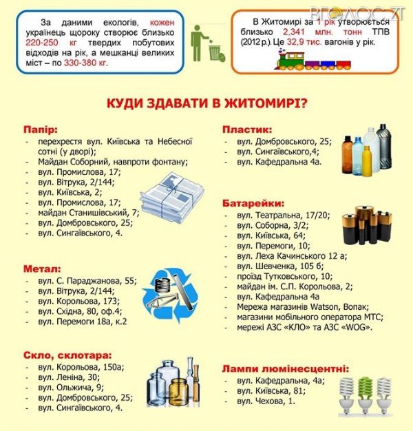 У рамках урбаністично-культурного заходу «Майстерня міста» студенти Житомирського державного технологічного університету поширили листівки з переліком адрес, куди у Житомирі здавати вторинну сировину – відпрацьовані лампи, батарейки, непотрібні метал, пластик і папір. Про це повідомила прес-служба університету.