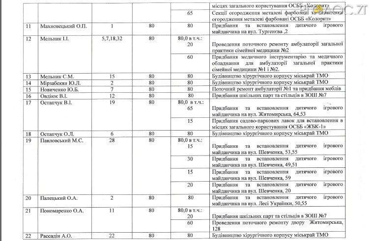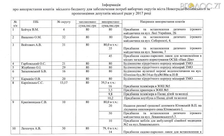 Депутати Новоград-Волинської міської ради на забезпечення потреб виборчих округів райцентру витратили майже 3 млн грн з бюджета міста. Зокрема, на встановлення ігрових майданчиків, будівництво хірургічного корпусу, потреби деяких ОСББ та відеоспостереження. Про це у відповідь на інформаційний запит «Вголос.zt» повідомила заступник керуючого справами виконкому Ніна Марчук.